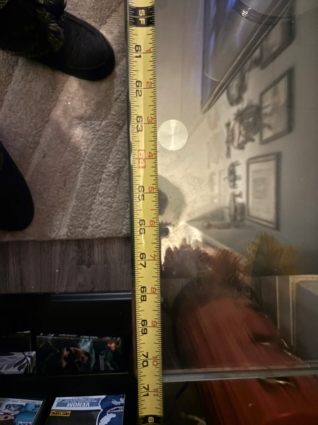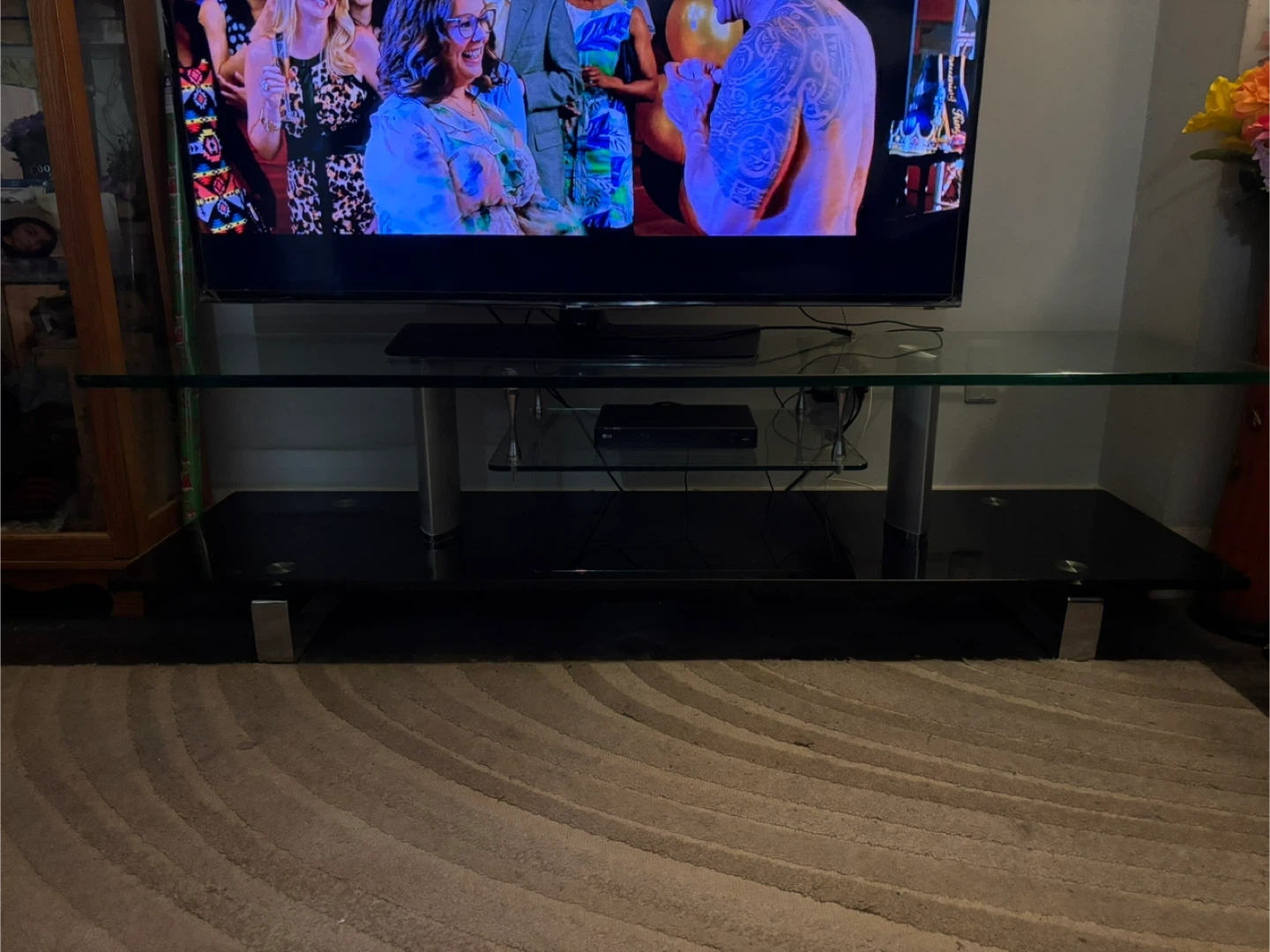 Selling a sleek black glass TV stand. It's in great shape and measures approximately 69 inches wide and 21 inches tall. Perfect for your living room setup! Very heavy Need a couple people to move it