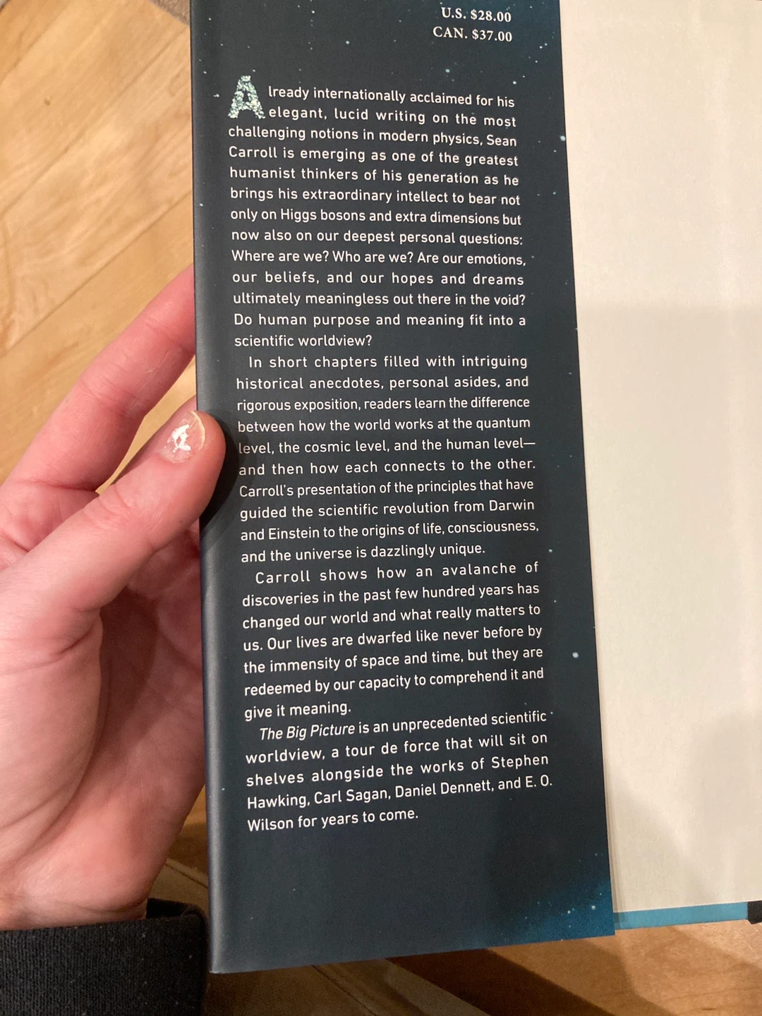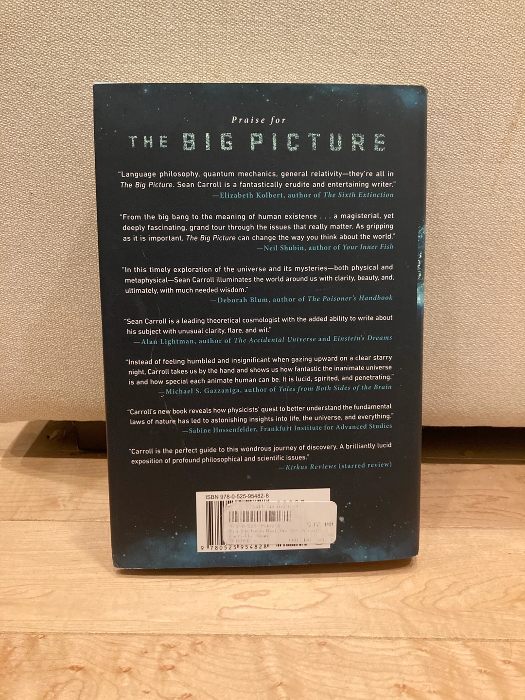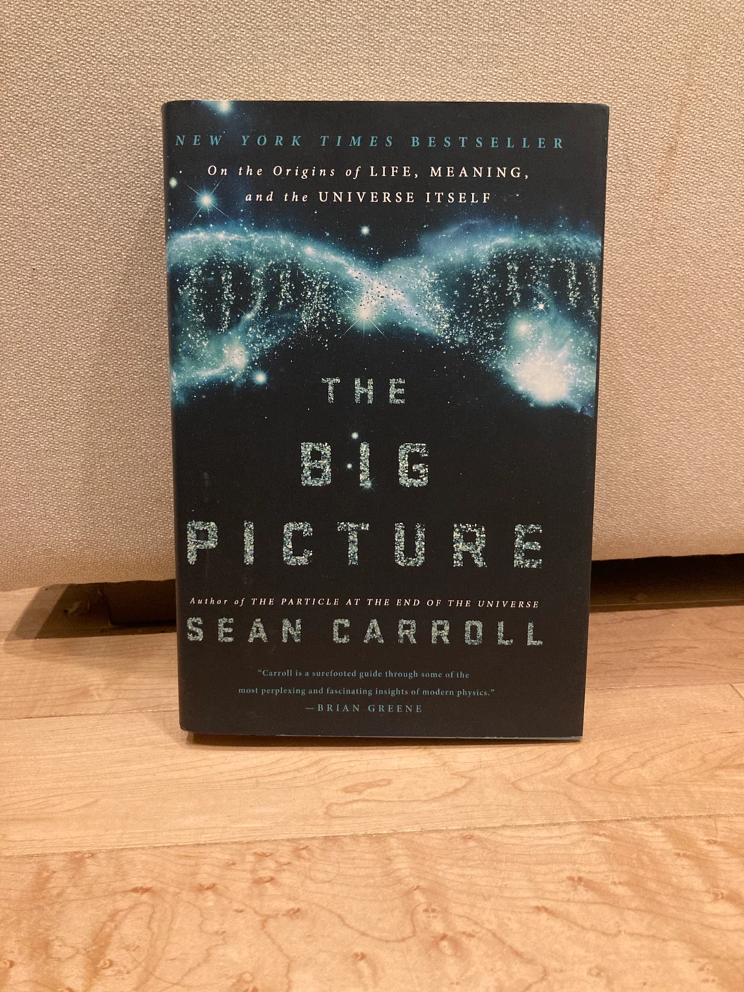Selling 'The Big Picture' by Sean Carroll, a New York Times Bestseller that explores the origins of life, meaning, and the universe itself. It's a thought-provoking read that delves into quantum mechanics and general relativity.