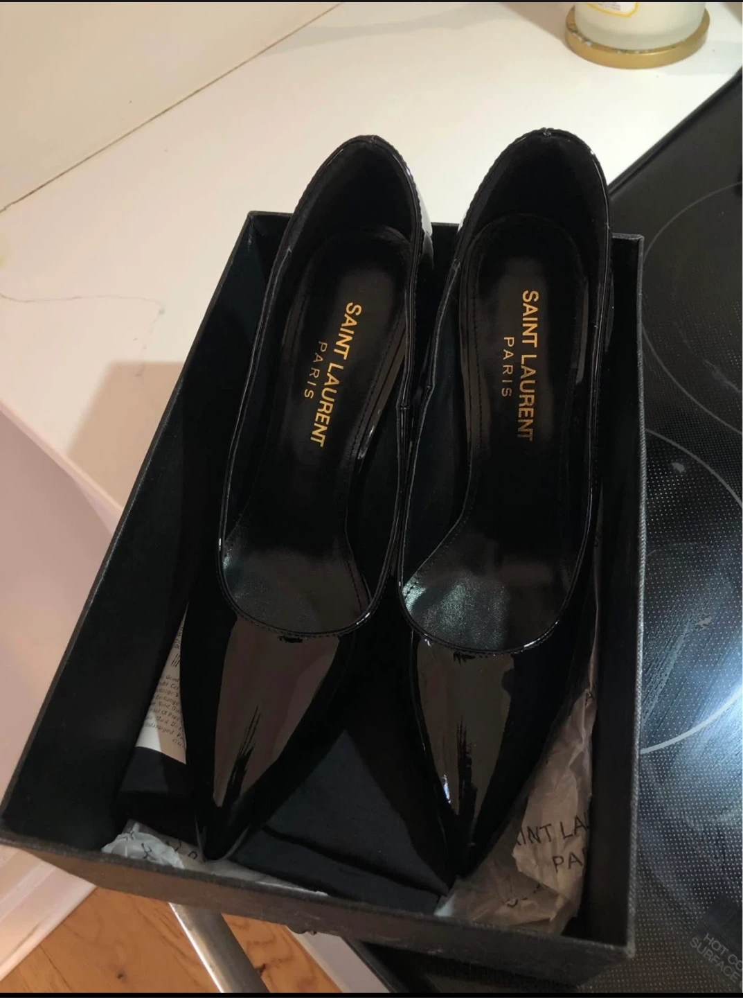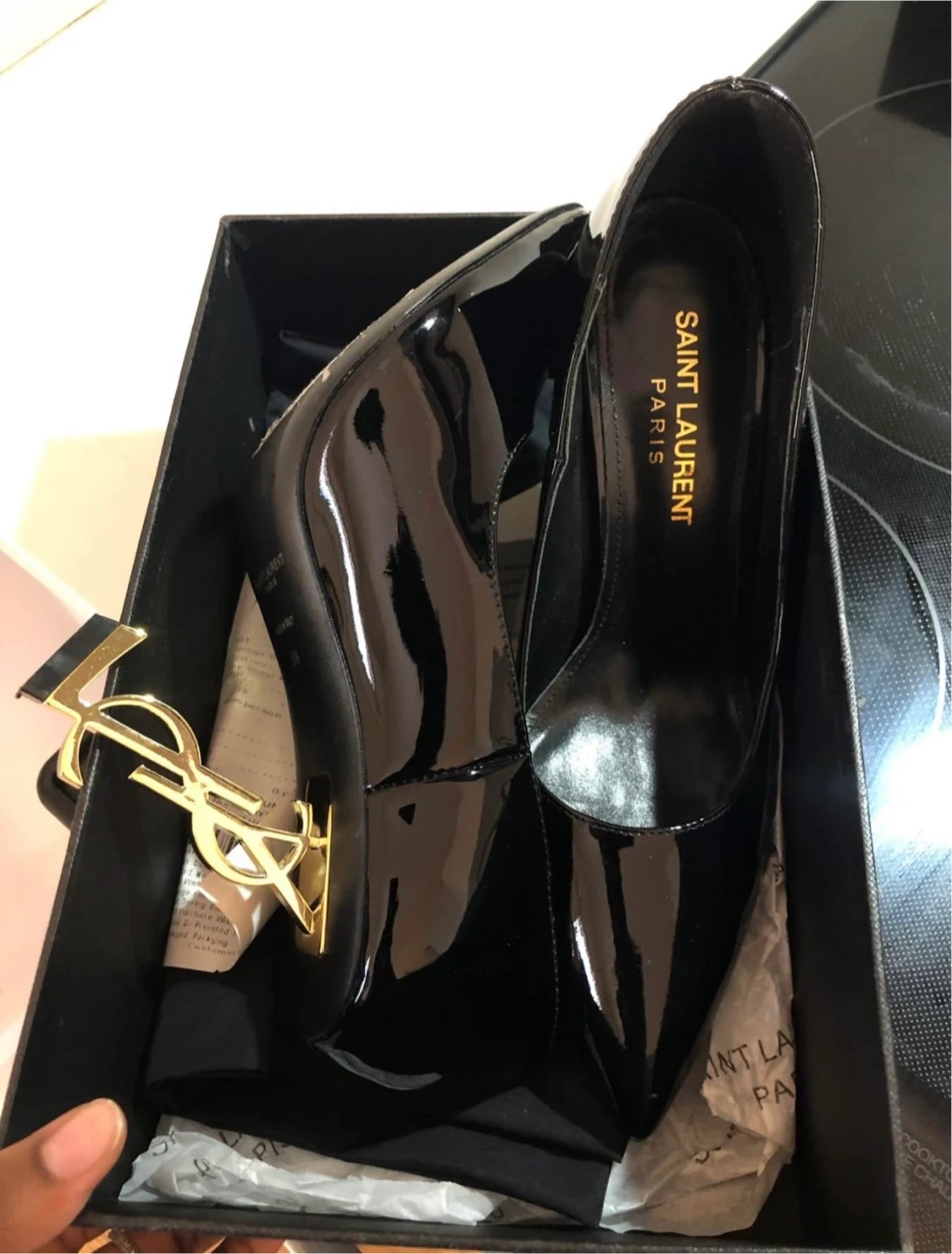 These Saint Laurent heels are a timeless addition to any wardrobe! They're crafted from sleek black patent leather, giving them a sophisticated and polished look. They come with the original box, making them easy to store and protect. Perfect for dressing up any outfit!