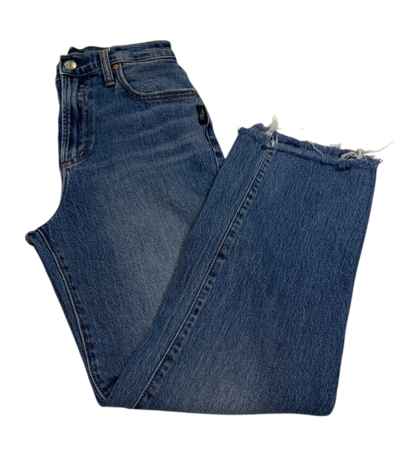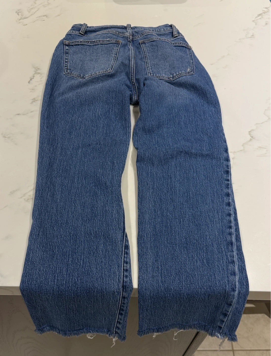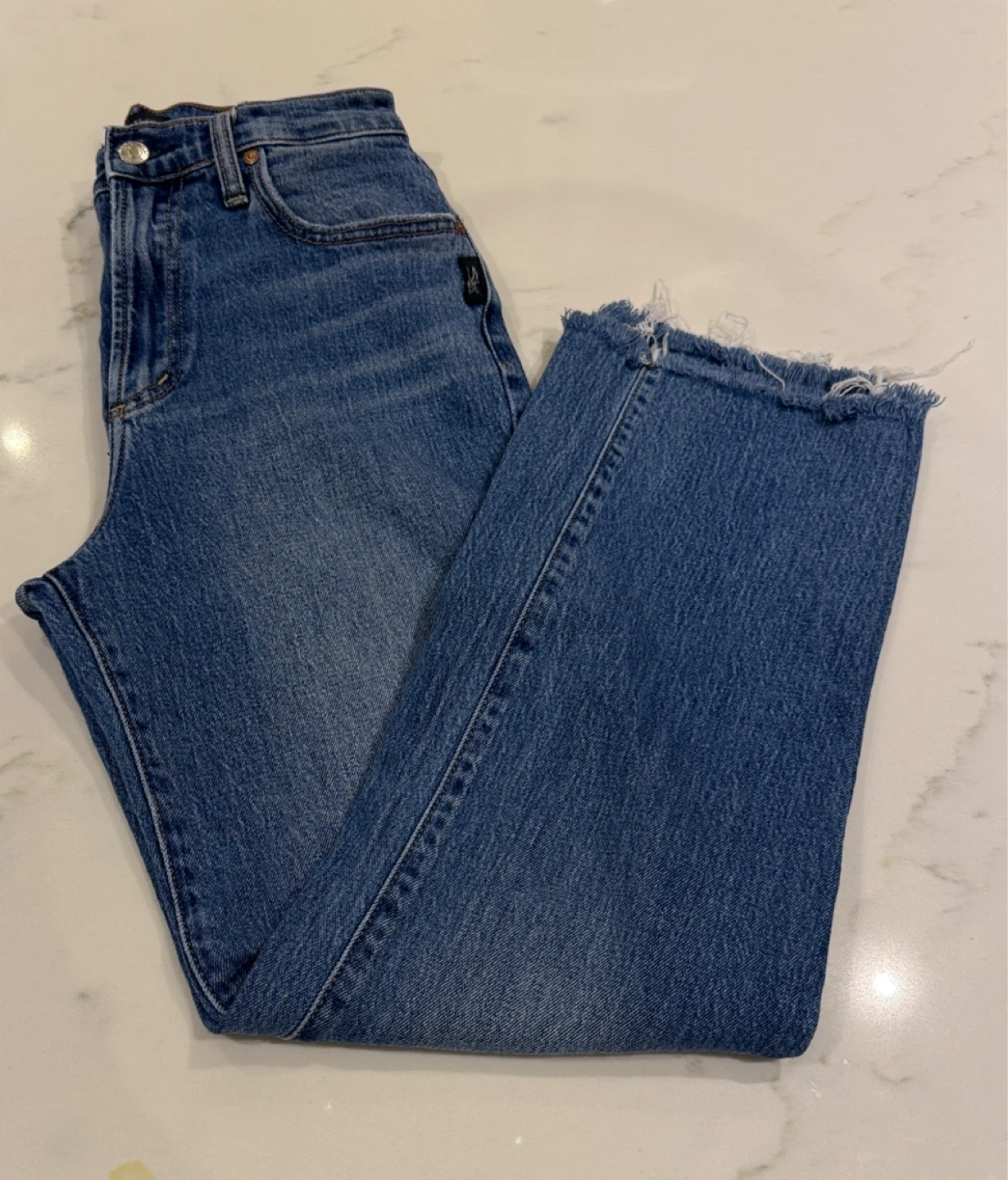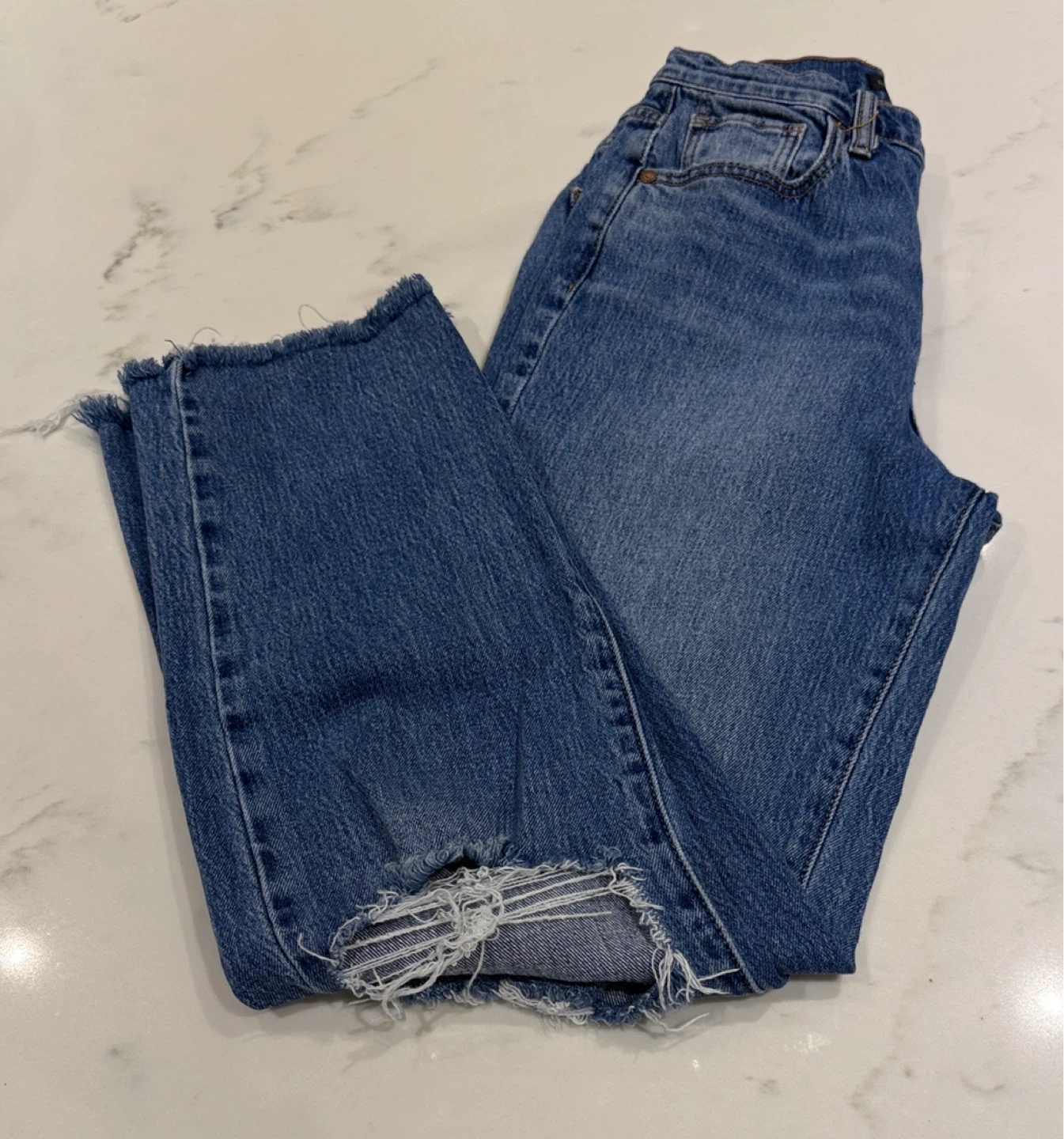 Here are some Silver Jeans Co. denim jeans. They are a blue colour and have a distressed look with a ripped knee. Great for a casual look! Inseam 28”