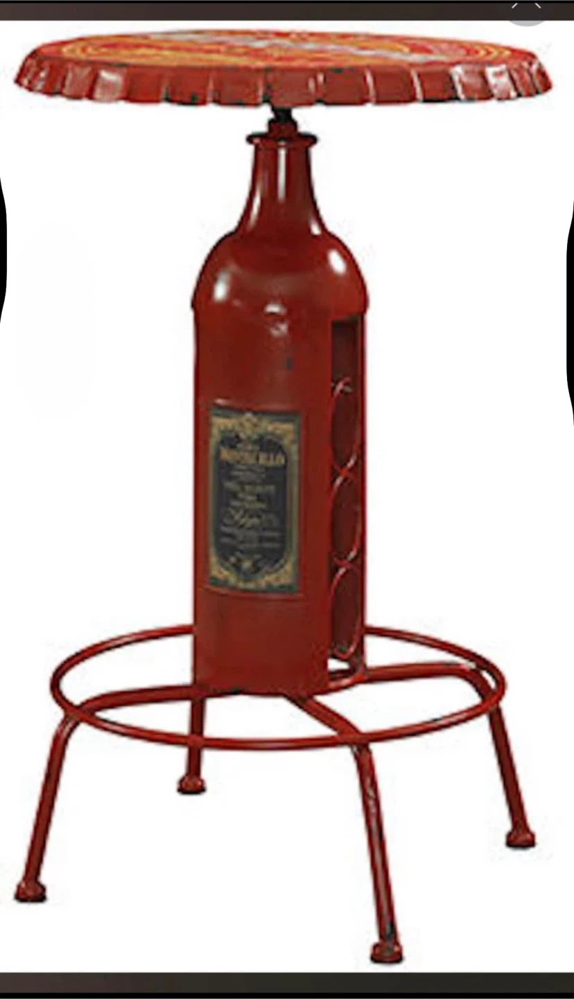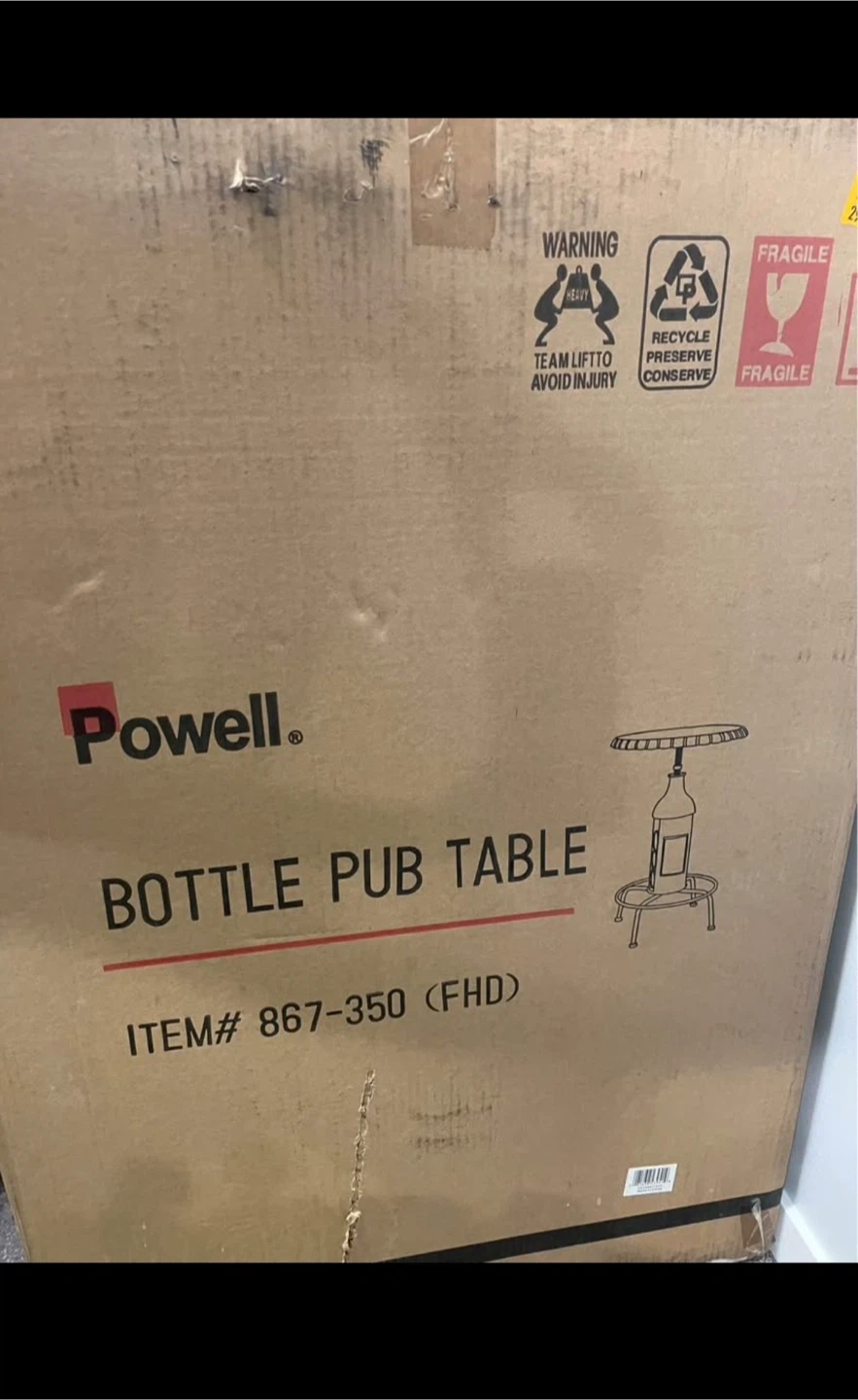 Selling a brand new Powell Bottle Pub Table, still in its original packaging! This unique table will add a fun touch to any space. It features distressed signage and form lending to function, with a bottle-shaped center post that accommodates 3 wine bottles. An oversized bottle cap top provides suitable space for entertaining, with a footrest below