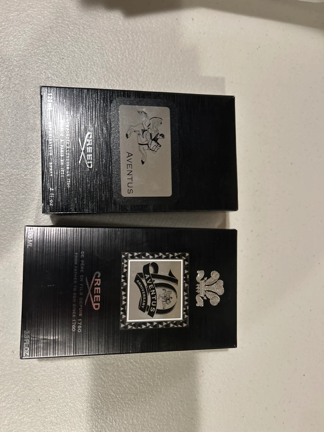 Selling two bottles of Creed Aventus! One is the standard Aventus and the other is the 10th Anniversary edition. The standard bottle is 120ml (4.1 fl oz) and the anniversary edition is 100ml (3.3 fl oz)