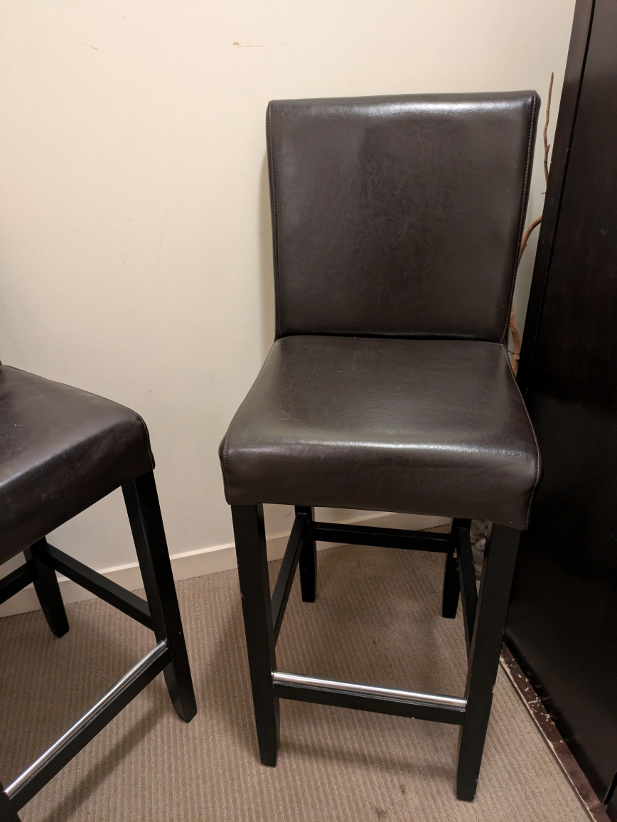 The faux leather is in excellent condition with no rips or tears or scuffs. The solid wooden legs on one stool have been reinforced with brackets and sturdy. Roughly 3ft-3.5ft high.