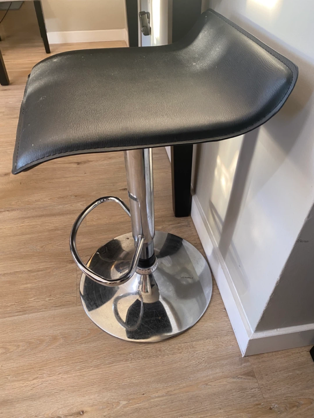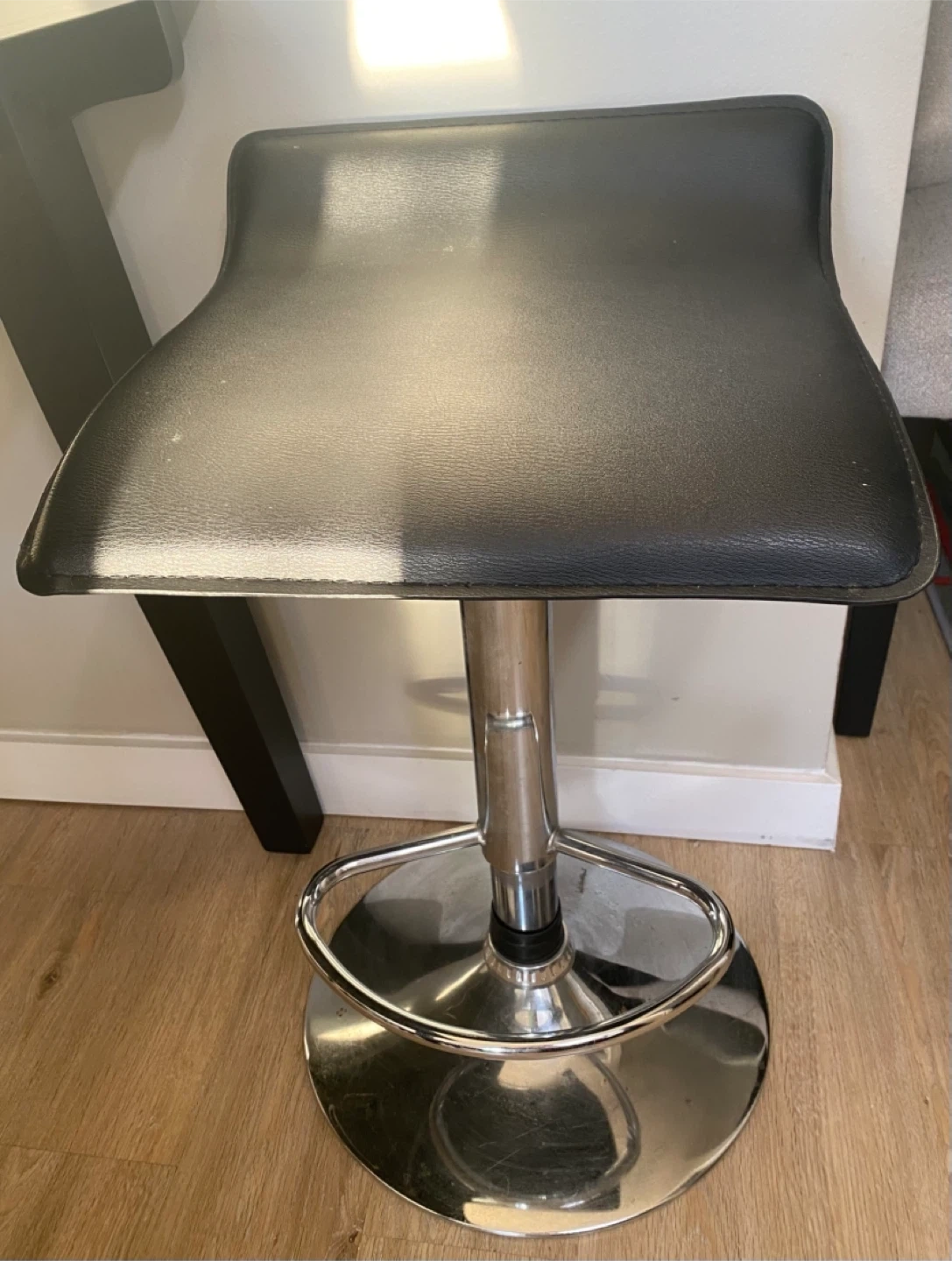 Selling a bar stool with a black seat and chrome base. It's in good condition and would look great in any kitchen or bar area. The stool has a comfortable seat and a sturdy base. Perfect for adding extra seating to your home!