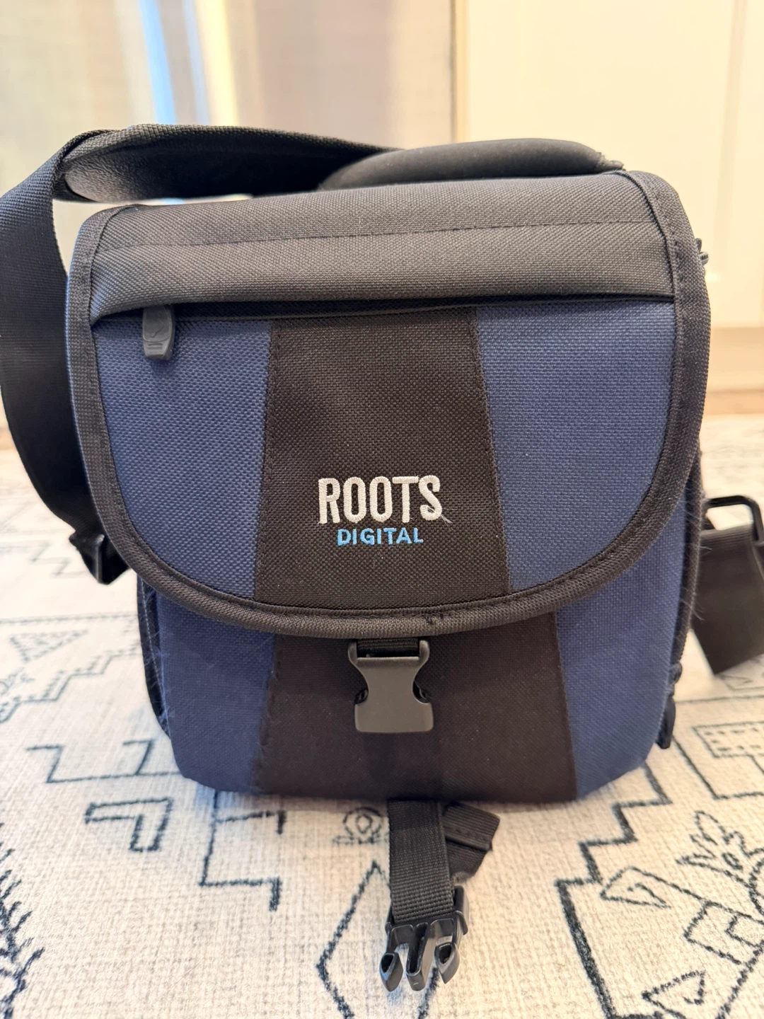 Selling a Roots Digital camera bag. It's in great shape and ready to carry your camera gear! The bag is a stylish mix of blue and black, perfect for keeping your camera safe on the go