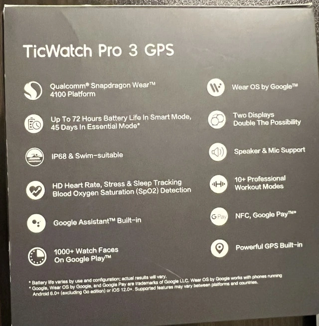 I'm selling a Ticwatch Pro 3 GPS smartwatch, which boasts a Qualcomm Snapdragon Wear 4100 Platform, up to 72 hours of battery life in smart mode, and is swim-suitable with its IP68 rating. Key features include: * Wear OS by Google * Two Displays for double the possibility * Speaker & Mic Support * HD Heart Rate, Stress & Sleep Tracking, Blood Oxygen Saturation (SpO2) Detection * 10+ Professional Workout Modes * Google Assistant Built-in * NFC, Google Pay * 1000+ Watch Faces on Google Play * Powerful GPS Built-in This smartwatch has been my trusty companion, but it's time for a new adventure on someone else's wrist! If this ad is still up, yes, it's available!