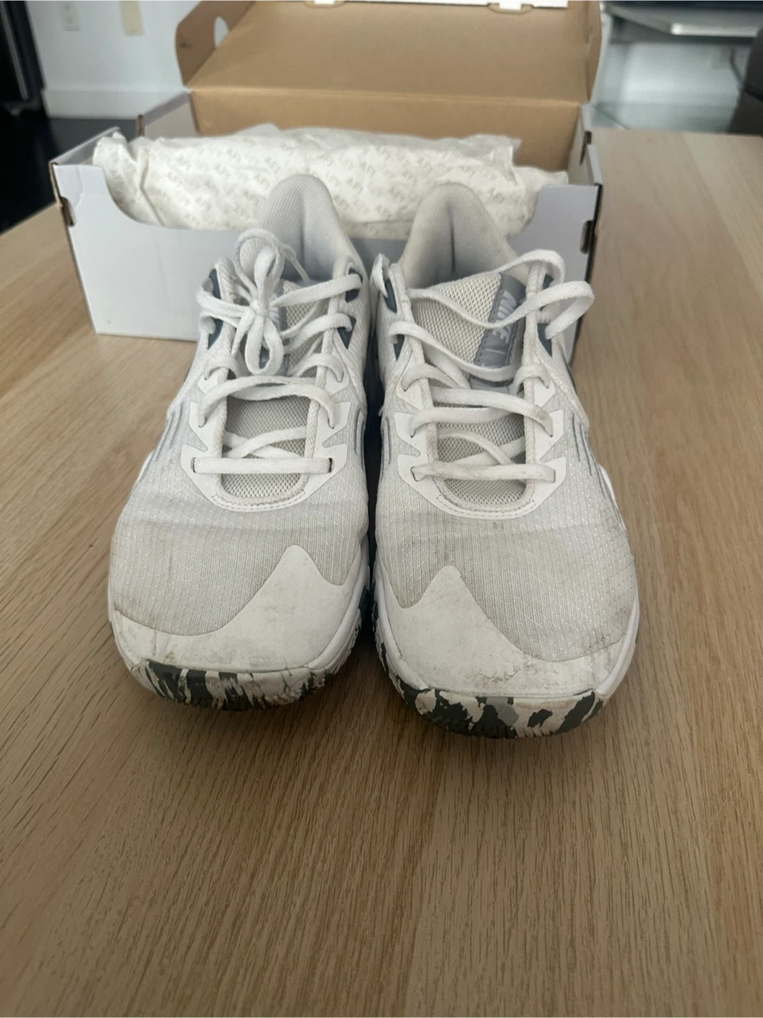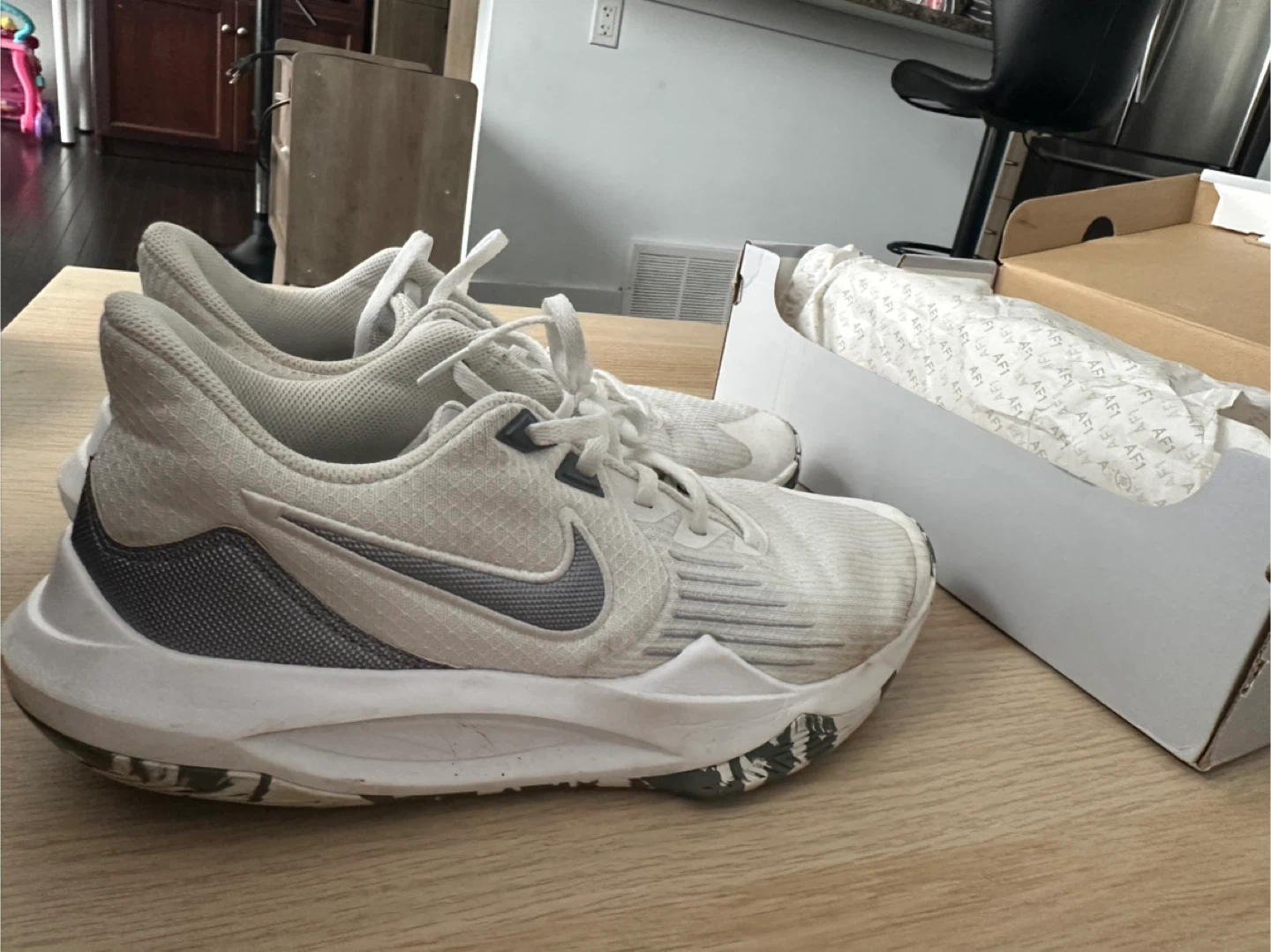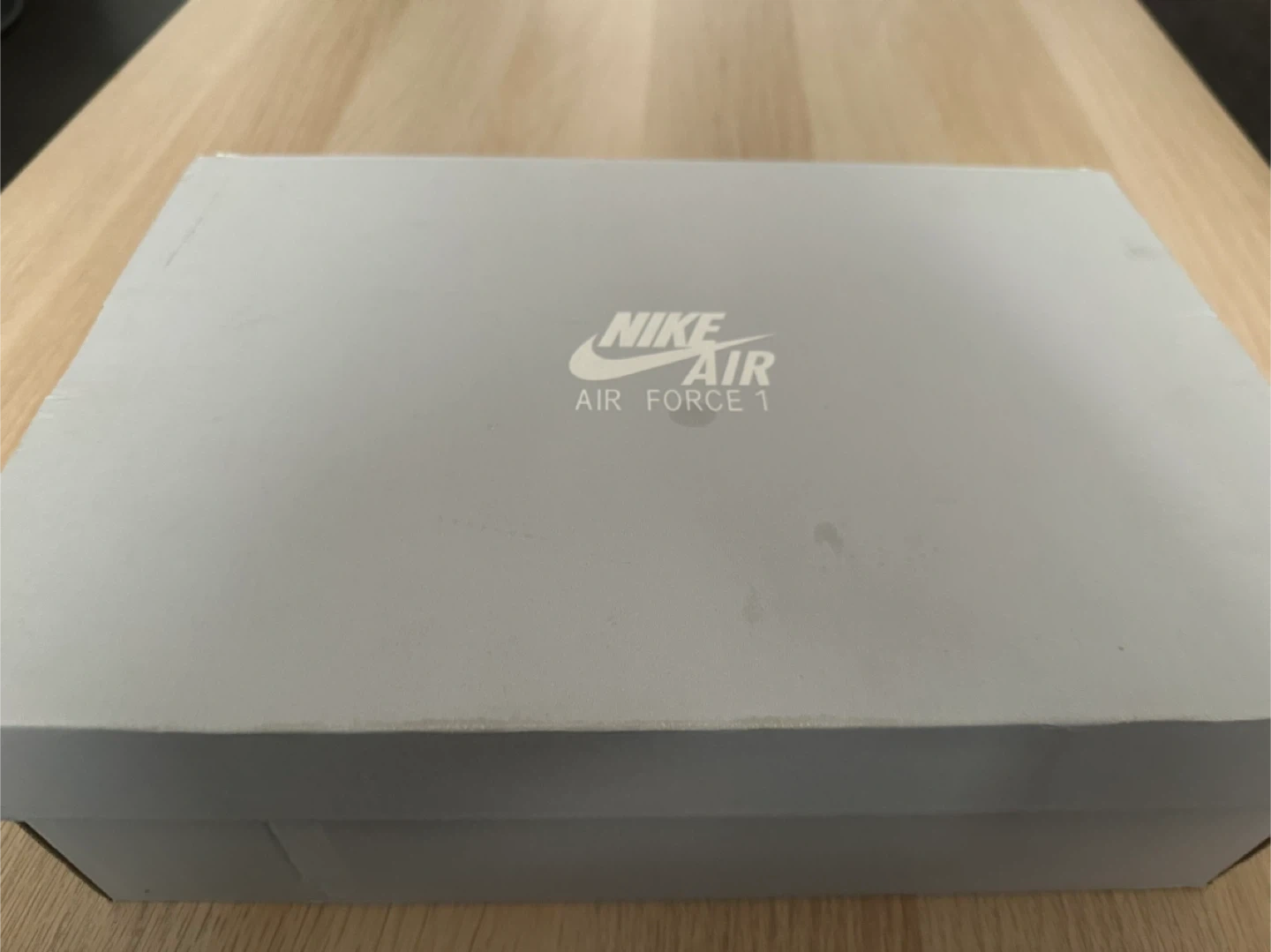 Selling a pair of Nike Air Force 1 sneakers in white. They come with the original box. Please take a look at the pictures for the condition!