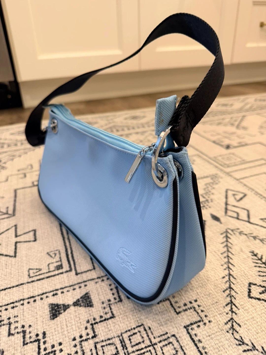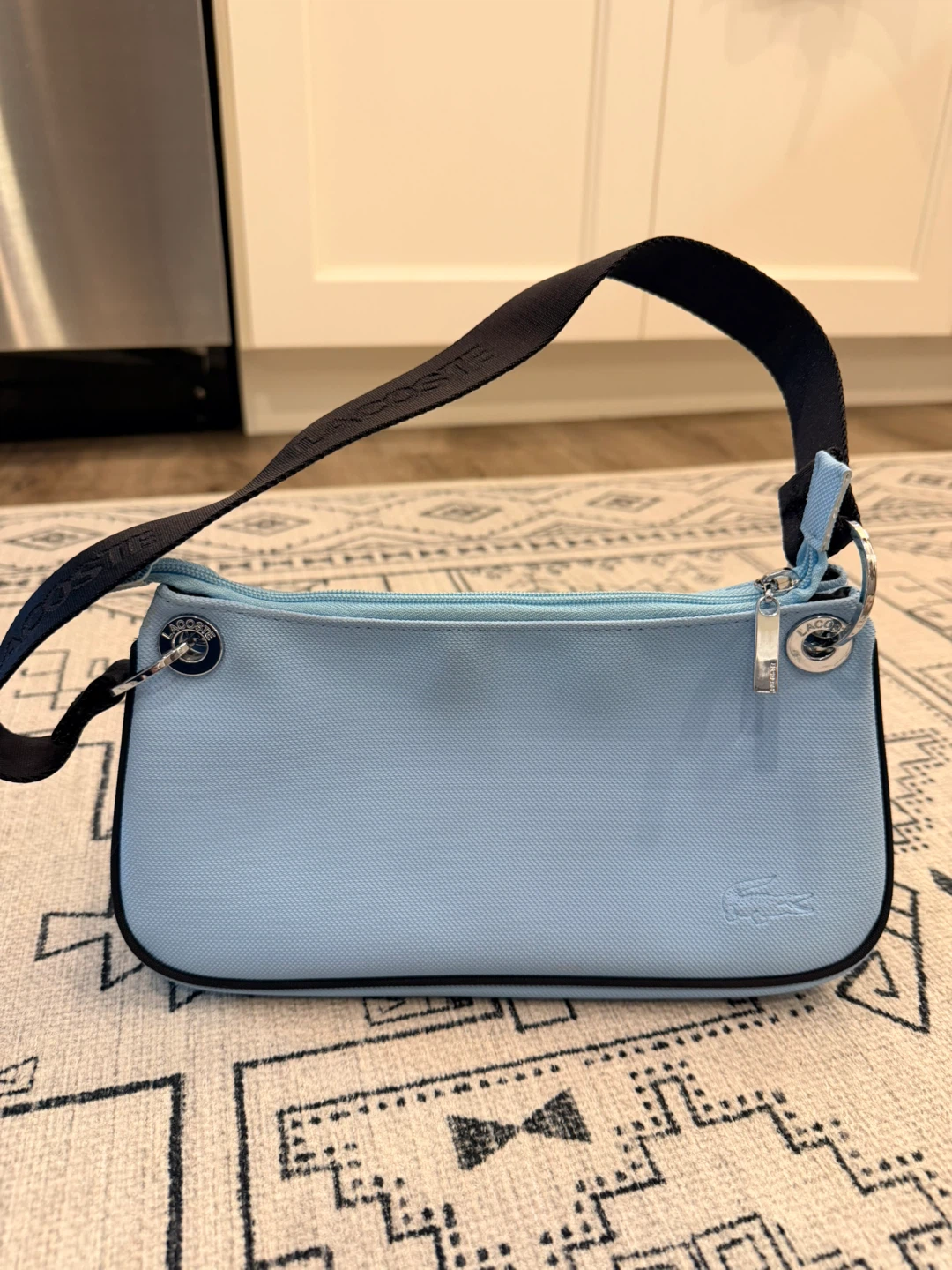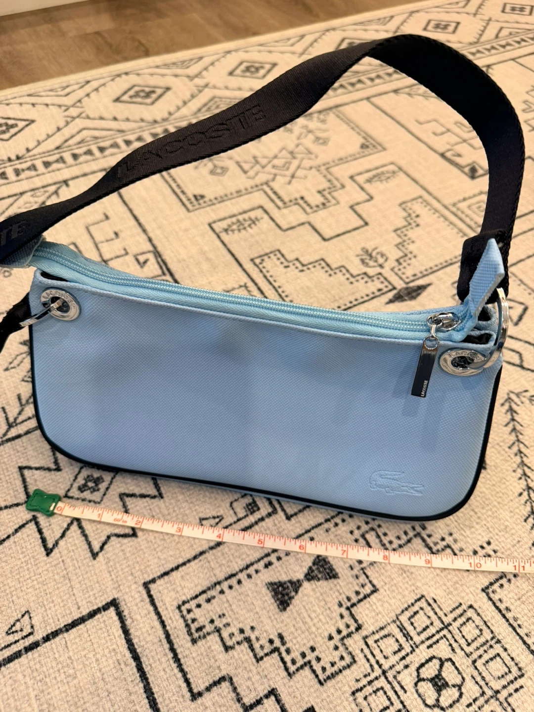 Cute Lacoste shoulder bag in a lovely light blue colour! It's in great condition and ready for a new owner. The strap is black and features the Lacoste logo. Perfect for adding a pop of colour to your outfit!