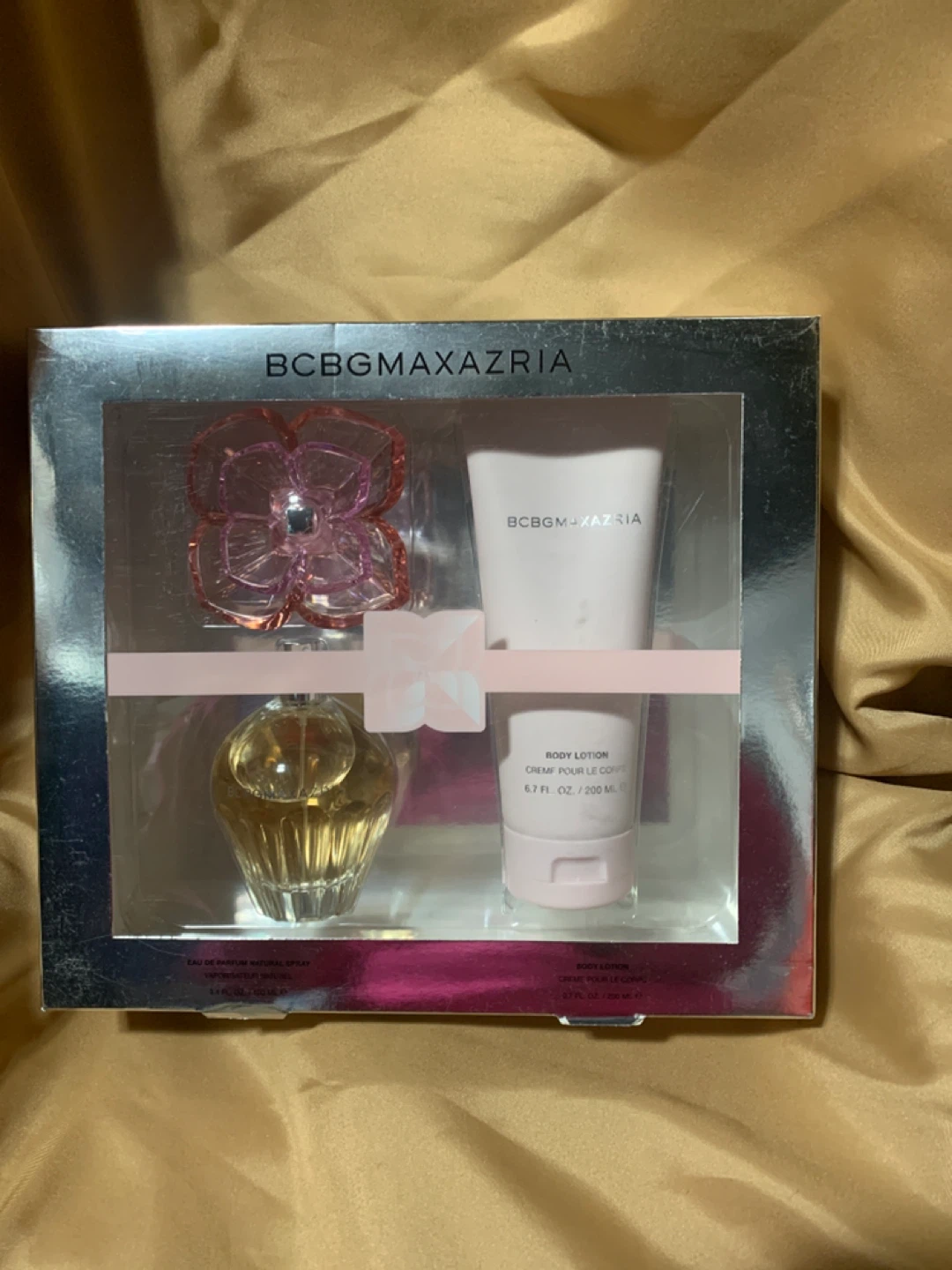 Selling a BCBGMAXAZRIA perfume and body lotion set. The set includes a natural spray perfume 100