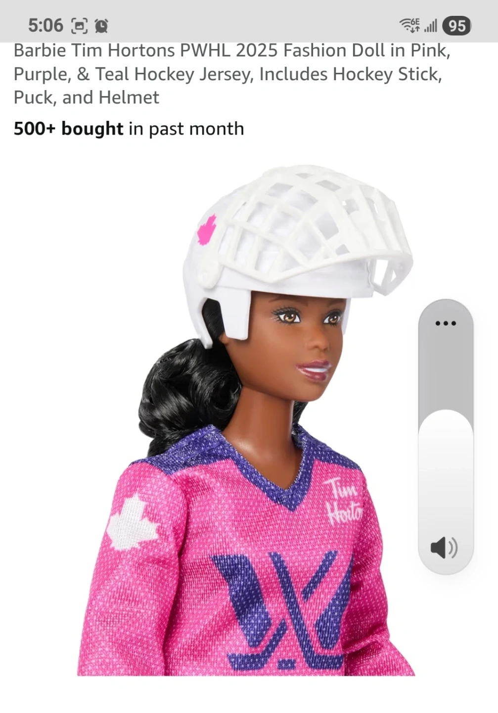 Selling a Barbie Tim Hortons PWHL 2025 fashion doll. It comes with a hockey stick, puck, and helmet. The doll is wearing a pink, purple, and teal hockey jersey. NEW STILL IN BOX. Collectors item.