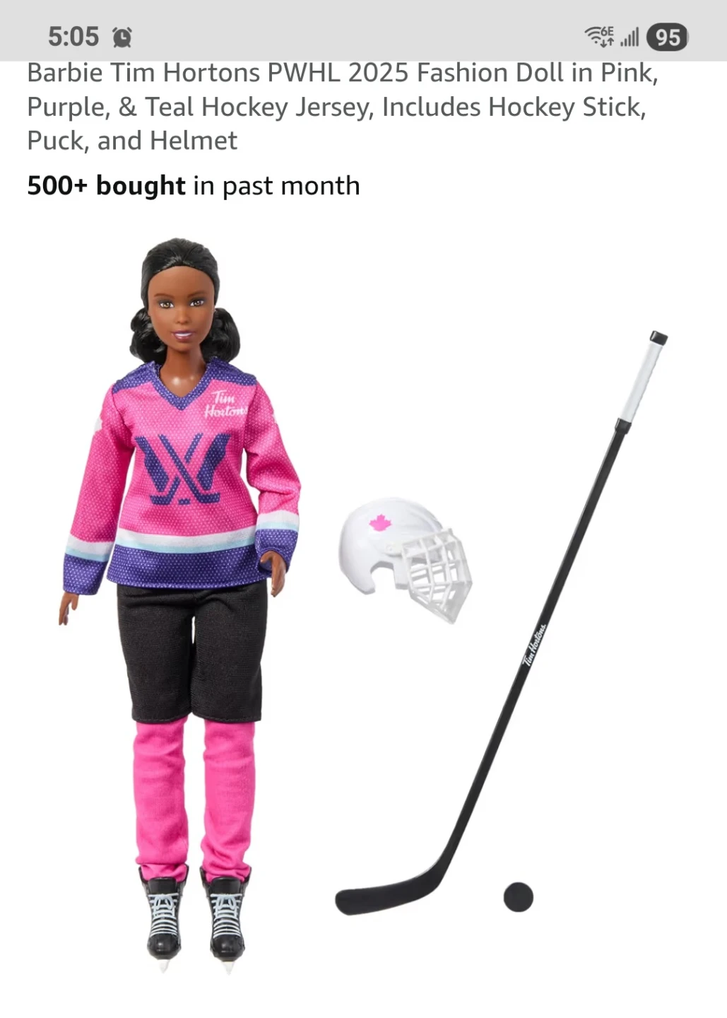 Selling a Barbie Tim Hortons PWHL 2025 fashion doll. It comes with a hockey stick, puck, and helmet. The doll is wearing a pink, purple, and teal hockey jersey. NEW STILL IN BOX. Collectors item.