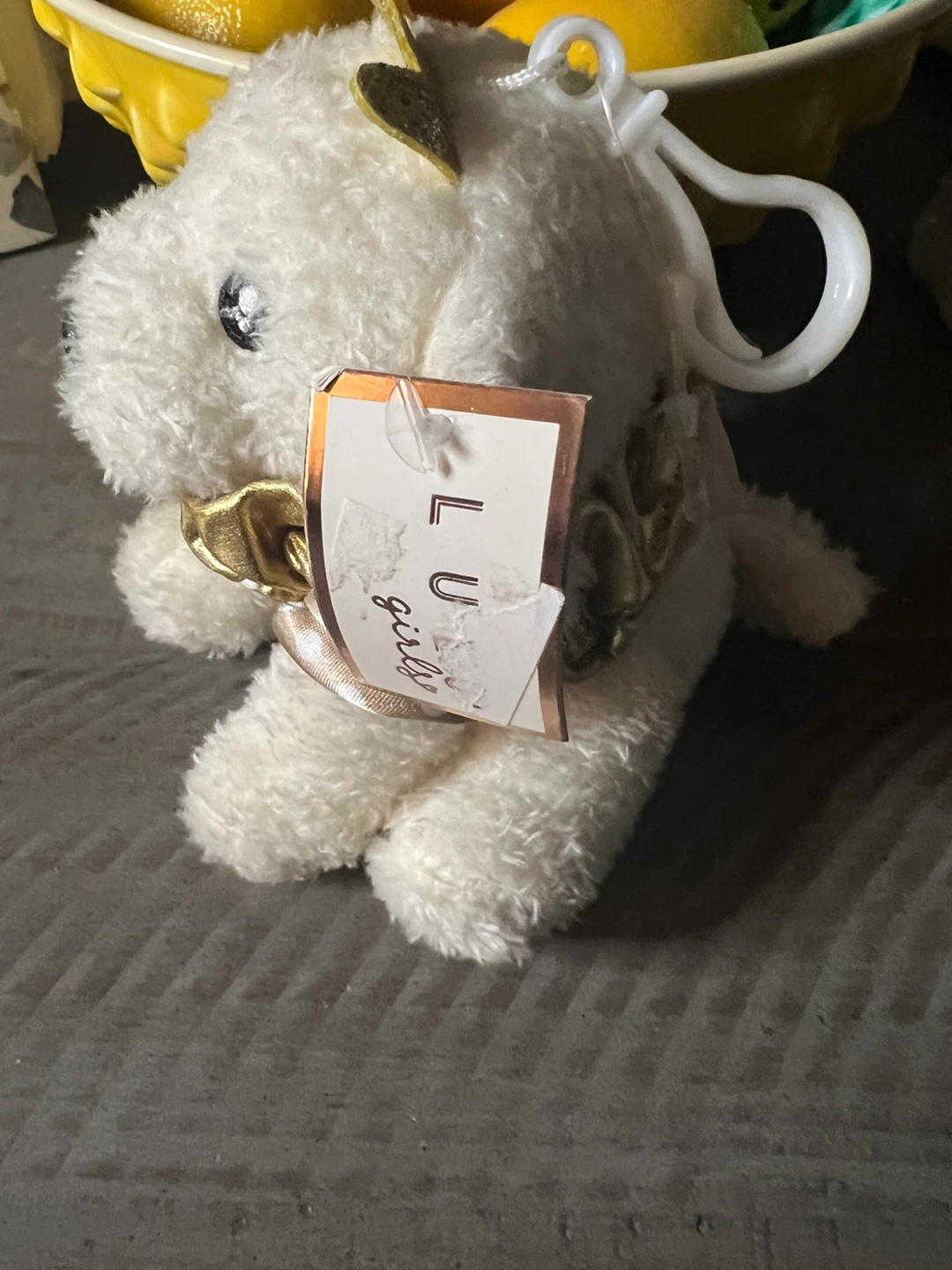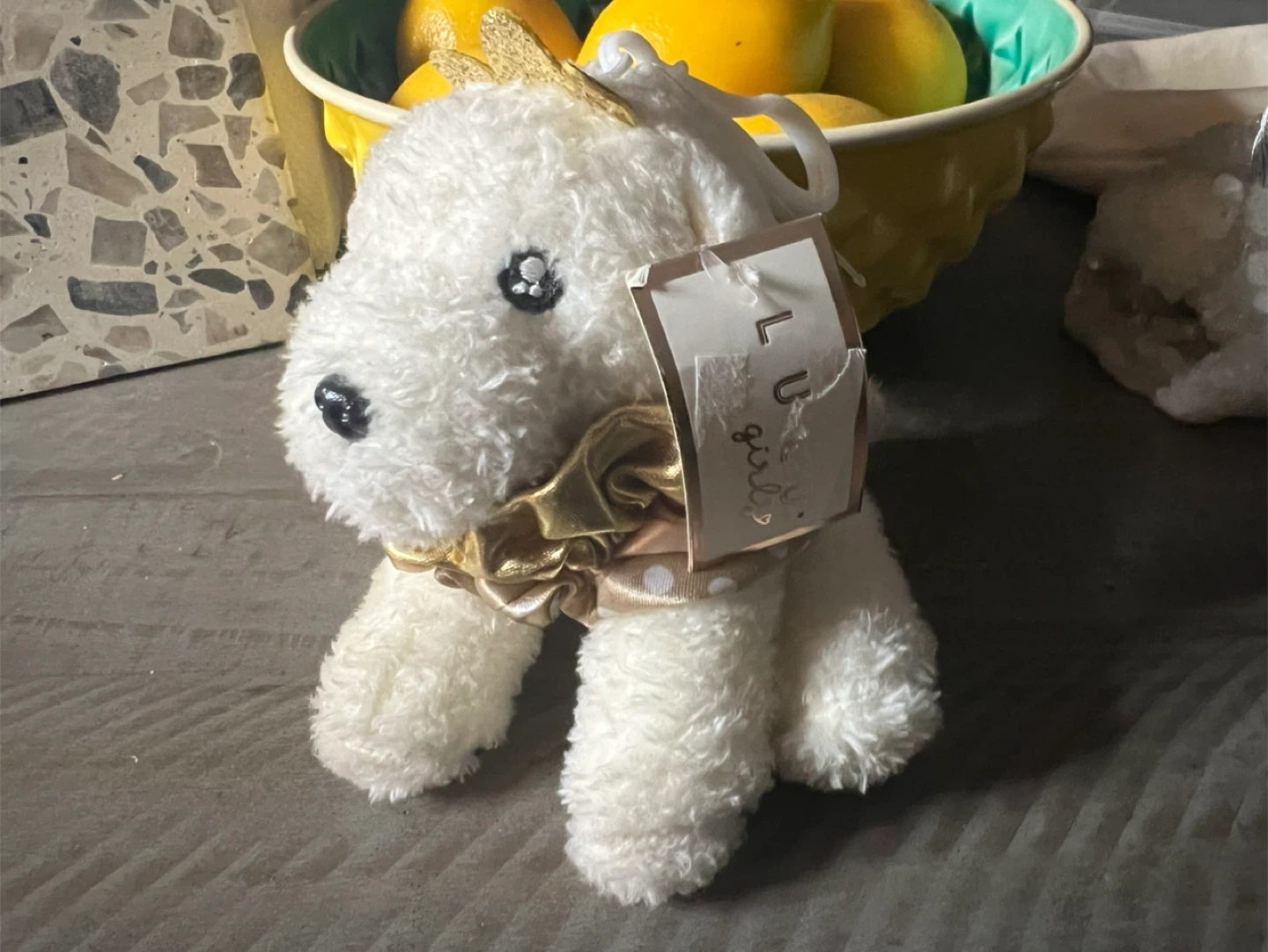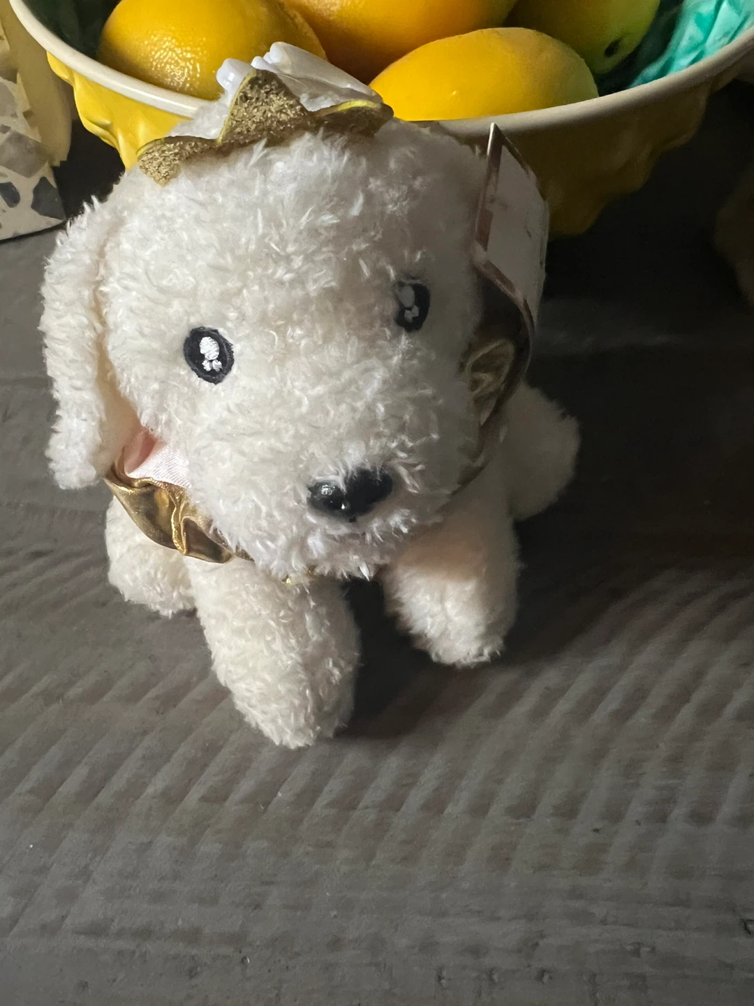 This is a cute white plush dog from L U girlz! It has a gold ribbon around its neck and a gold crown on its head. It's in great condition!