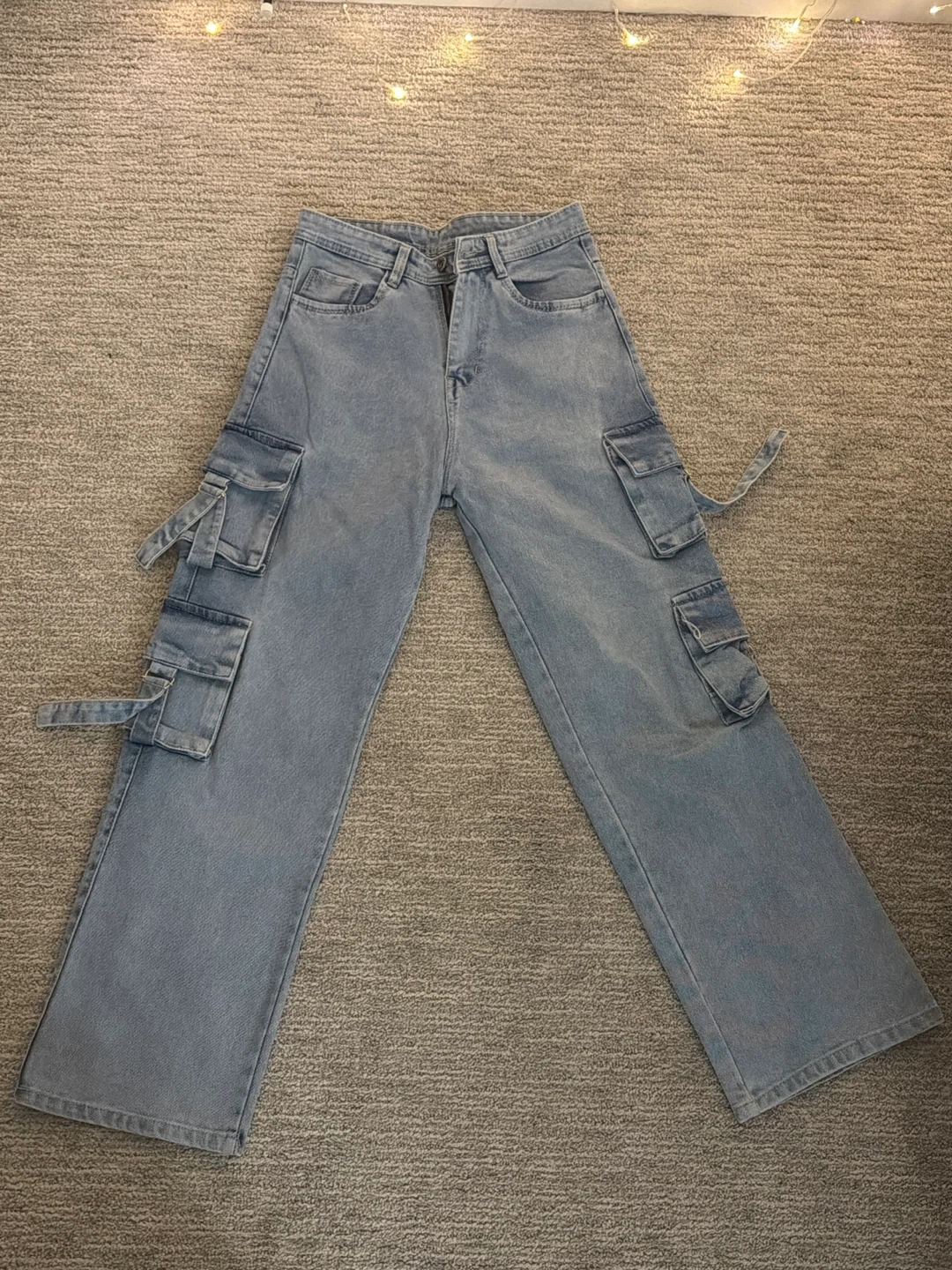 Here are some light blue denim cargo pants! They feature multiple pockets and adjustable straps on the sides of the cargo pockets. Perfect for a casual, trendy look! size 28