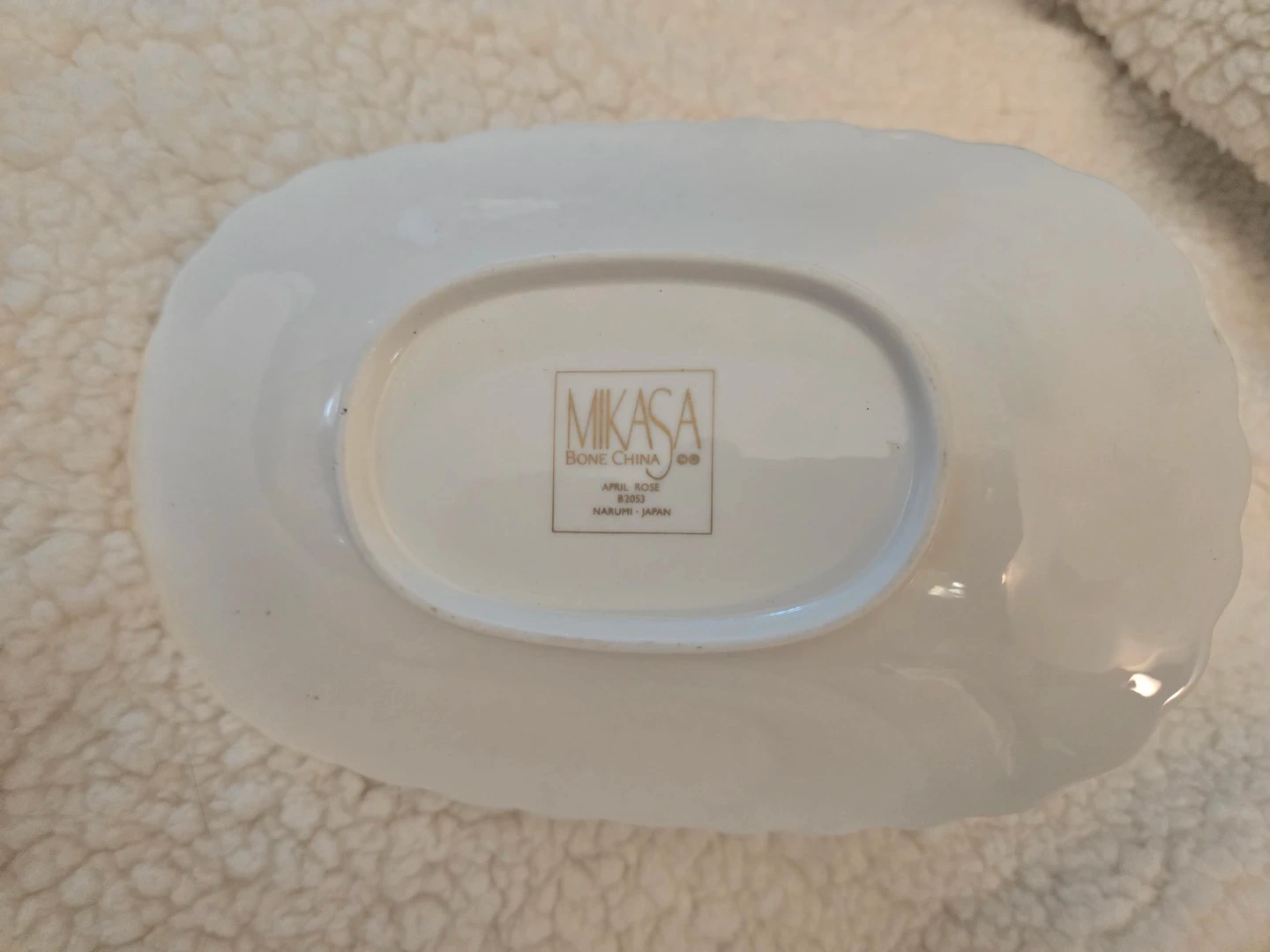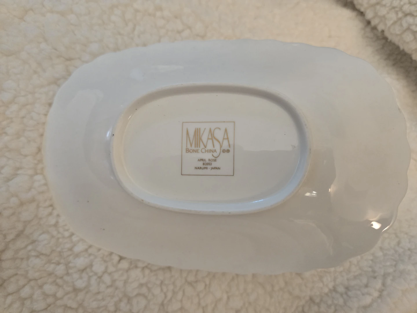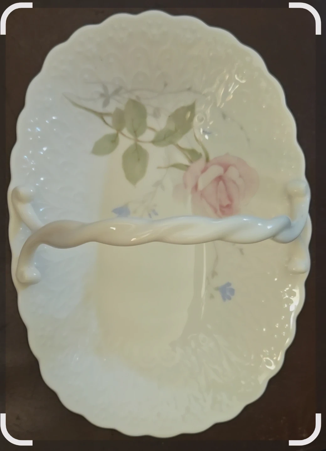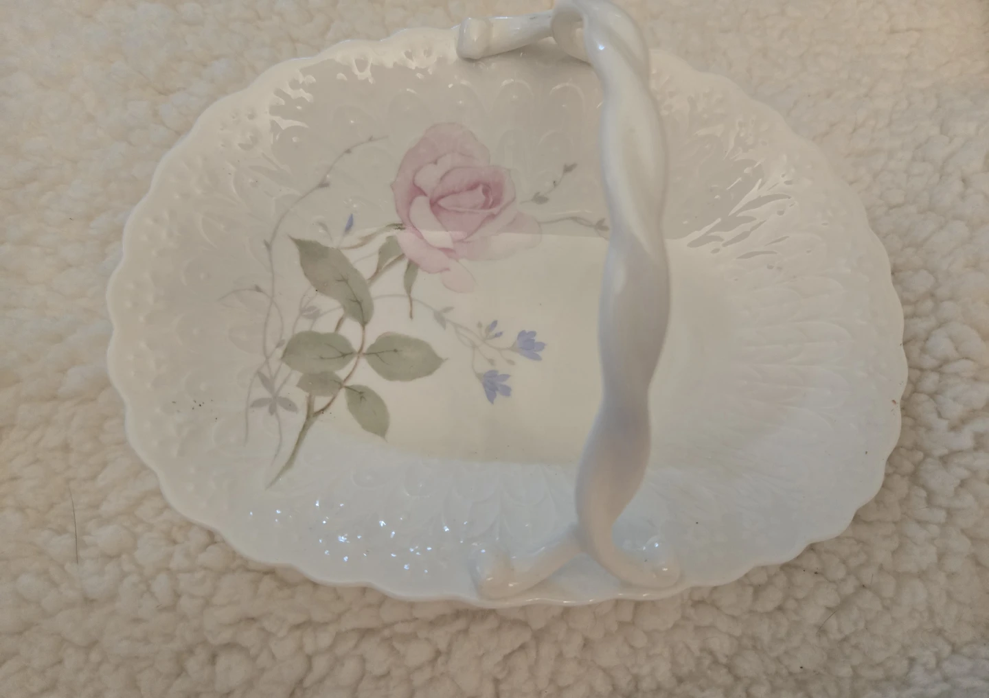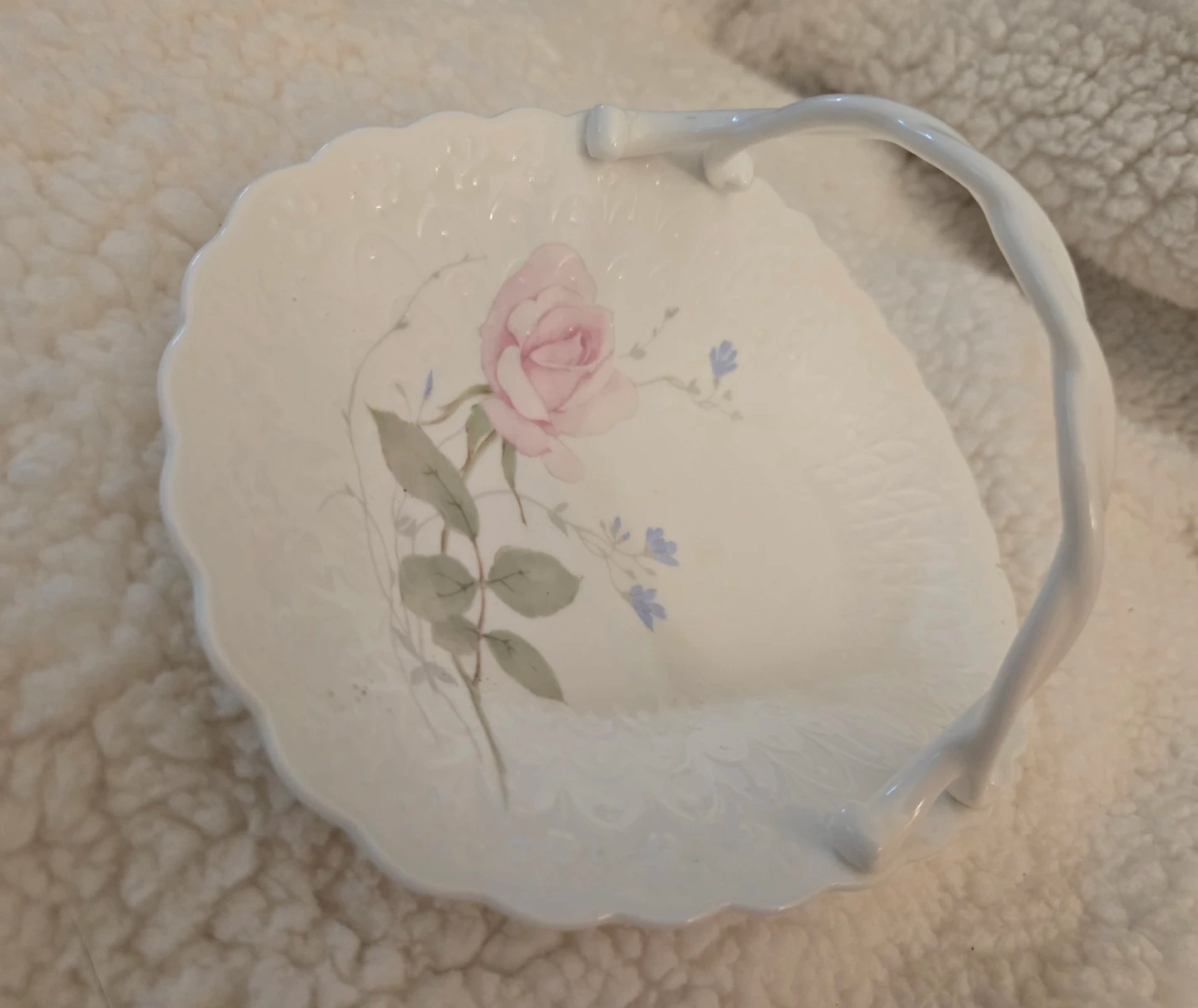 This is a Mikasa April Rose bone china basket with a twisted handle.