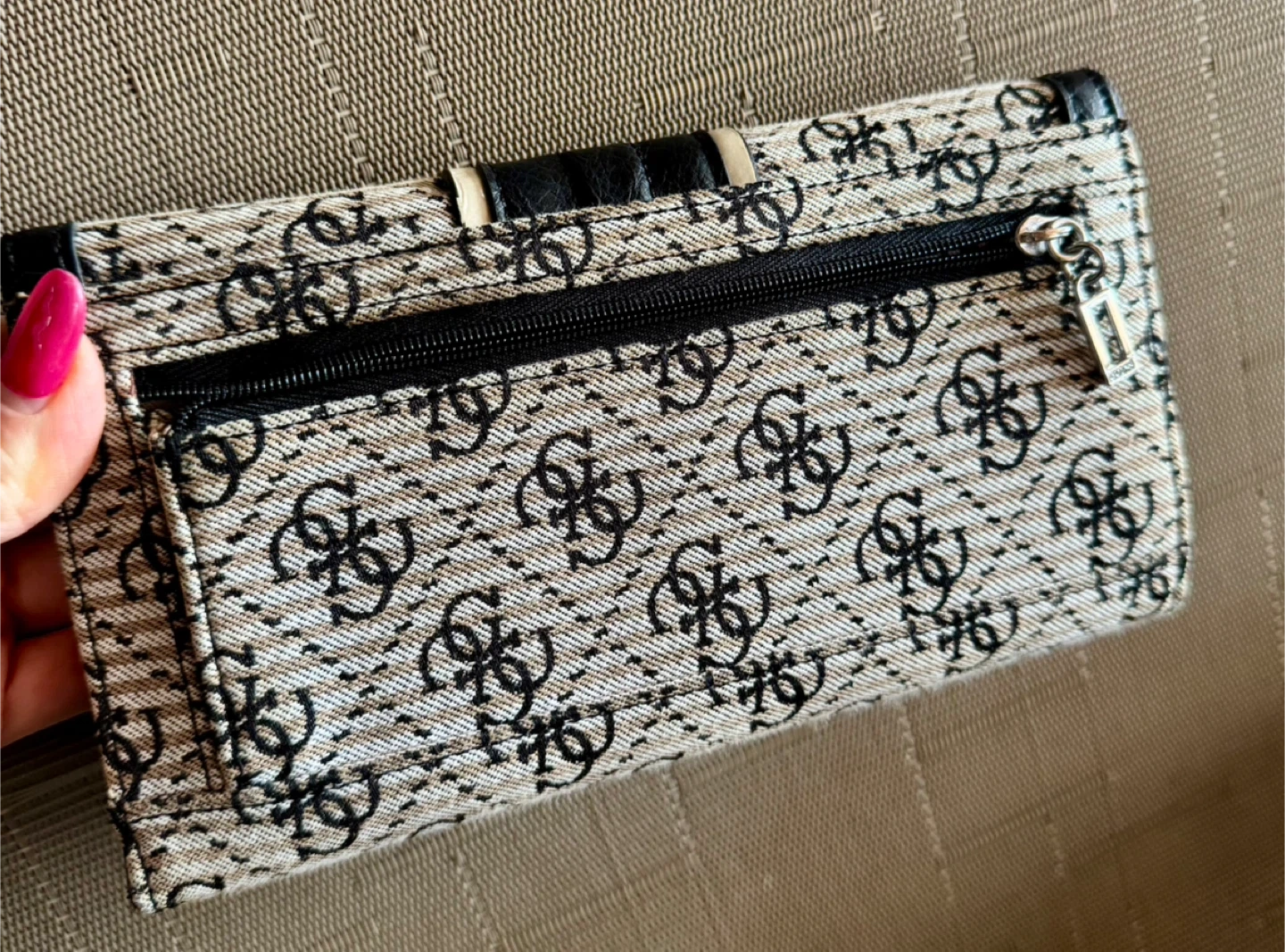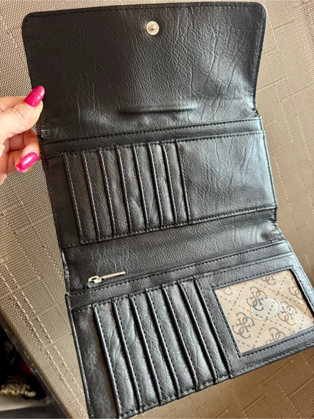 Selling a Guess wallet in good condition! It has a stylish design with the Guess logo pattern. The interior features multiple card slots and a zippered compartment for coins. Perfect for keeping your essentials organized!