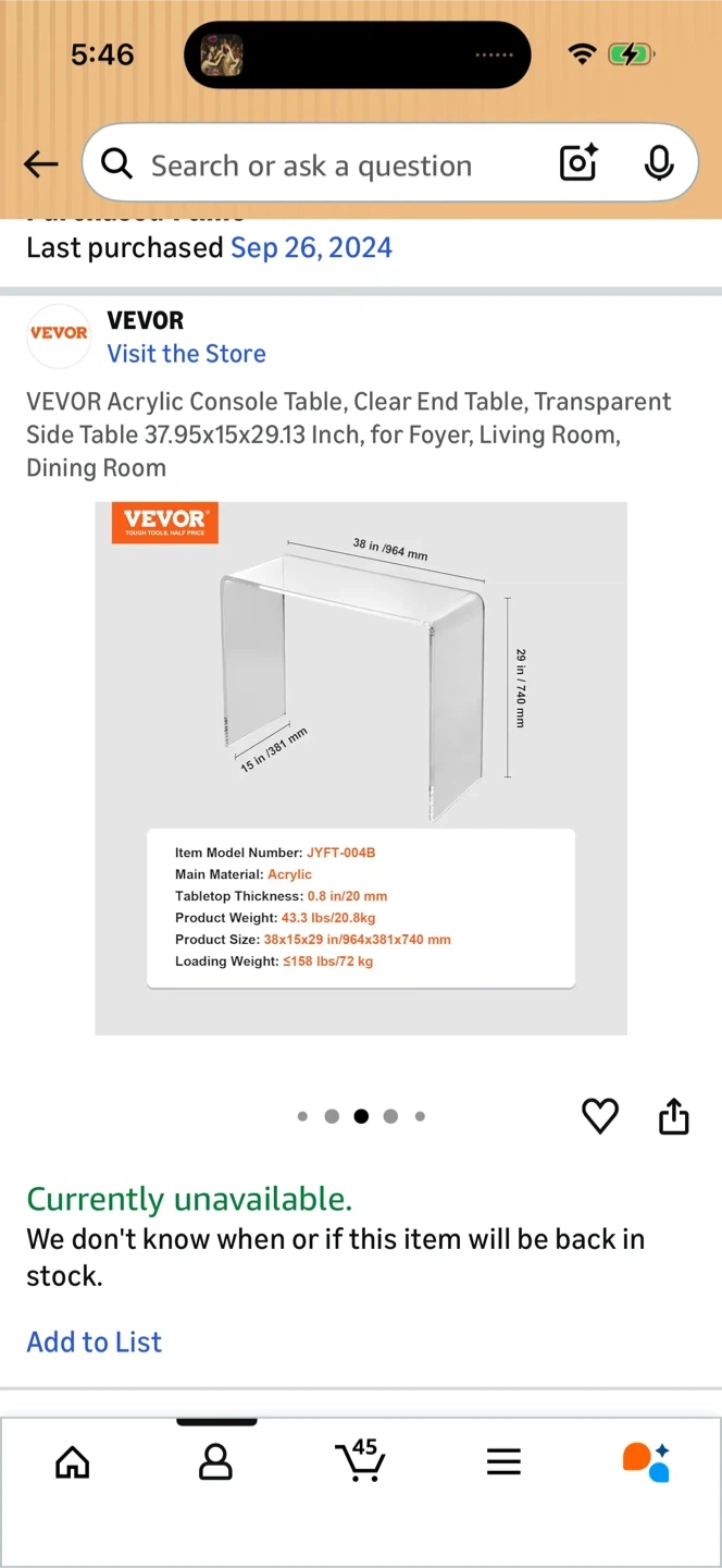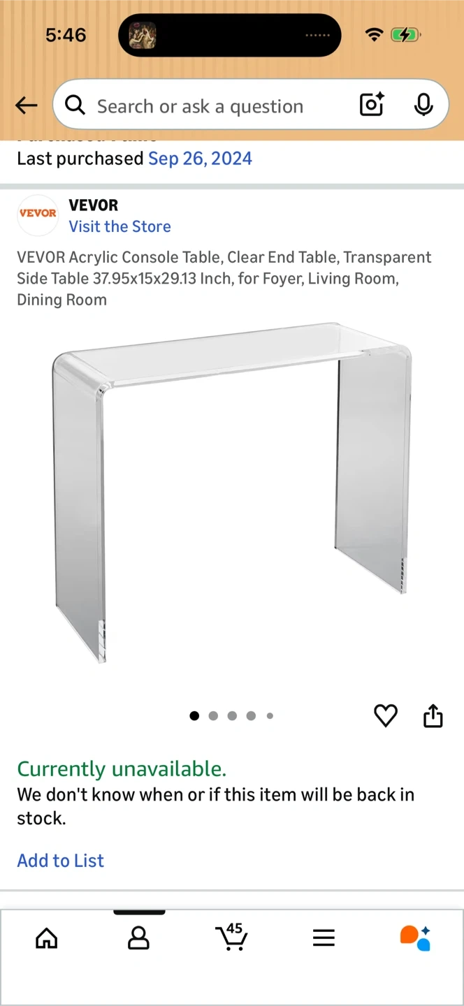Selling a VEVOR acrylic console table, perfect as an end table or side table for your living room, dining room, or foyer.