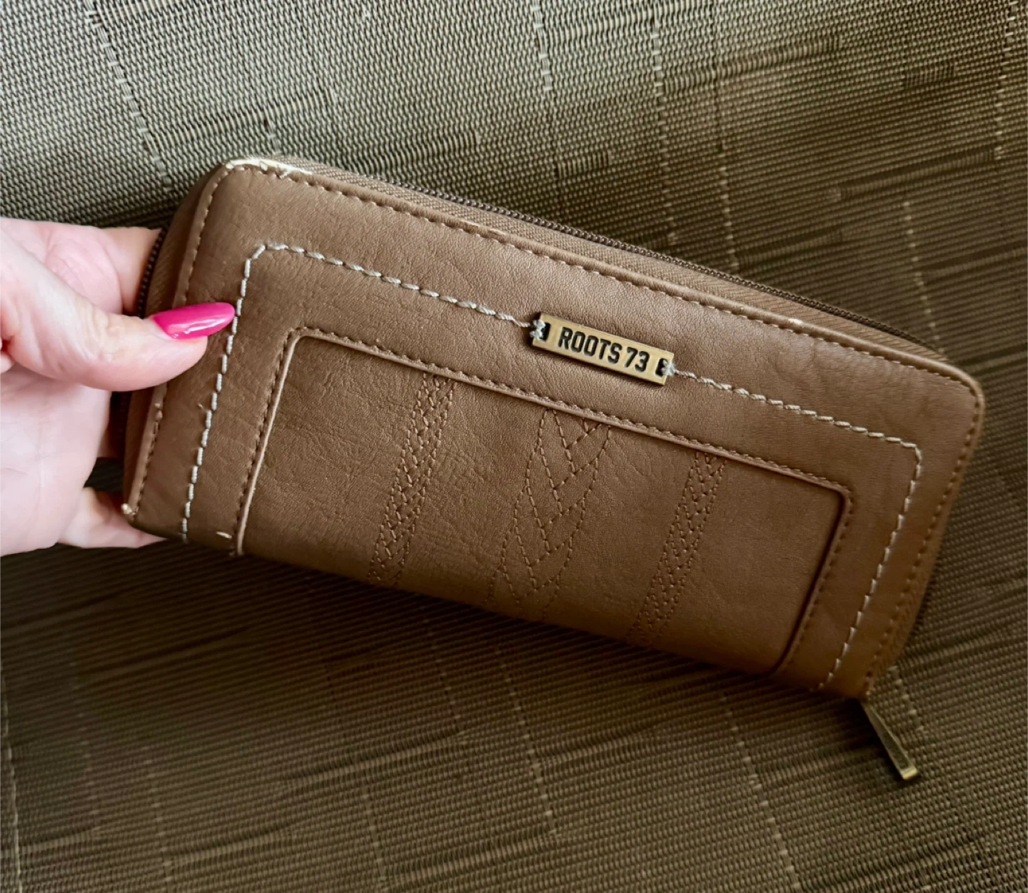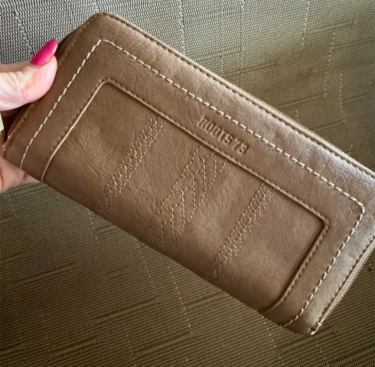 Selling a Roots 73 wallet in brown. It has a zippered closure and lots of slots for cards and cash. It's in good condition!