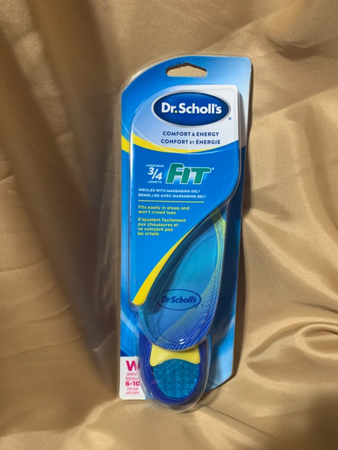 I'm selling a new pair of Dr. Scholl's Comfort & Energy 3/4 Fit insoles! These insoles have massaging gel and fit easily in shoes without crowding your toes. They're designed for women's sizes 6-10