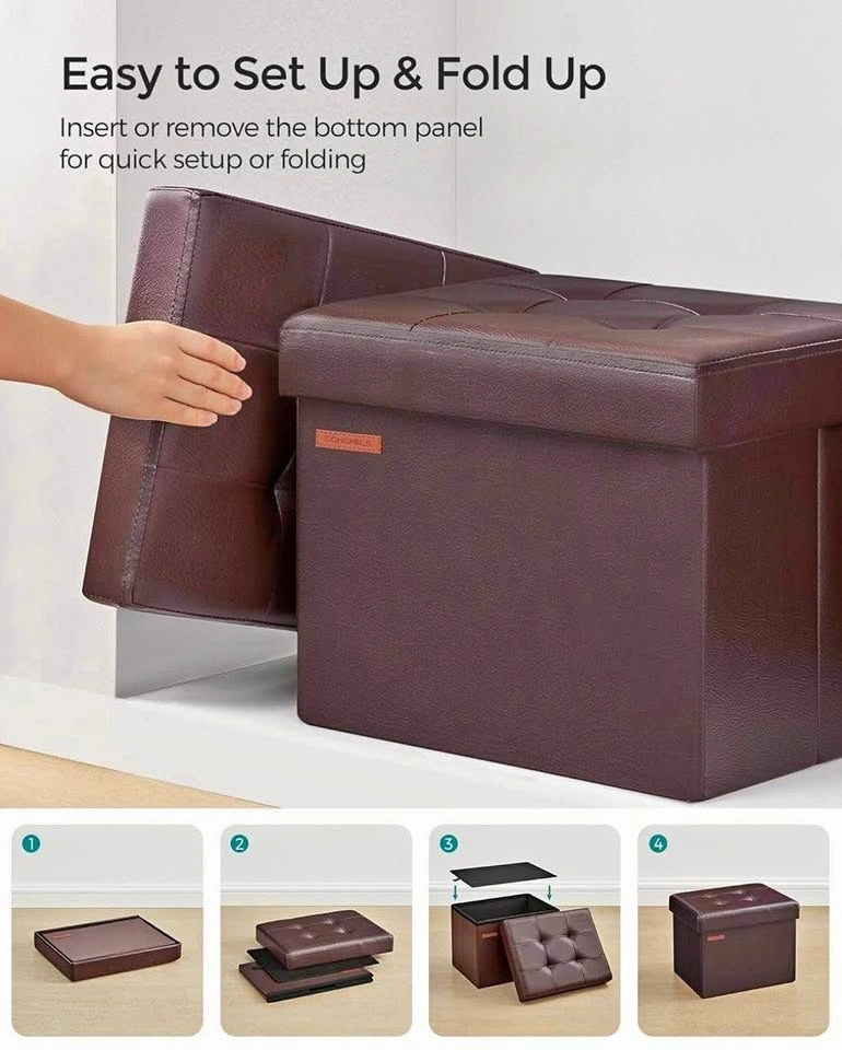 Compact yet sturdy, it supports up to 286 lb and folds flat when not in use. The chestnut brown synthetic leather looks elegant and fits beautifully in any living room, bedroom, dorm, or entryway.