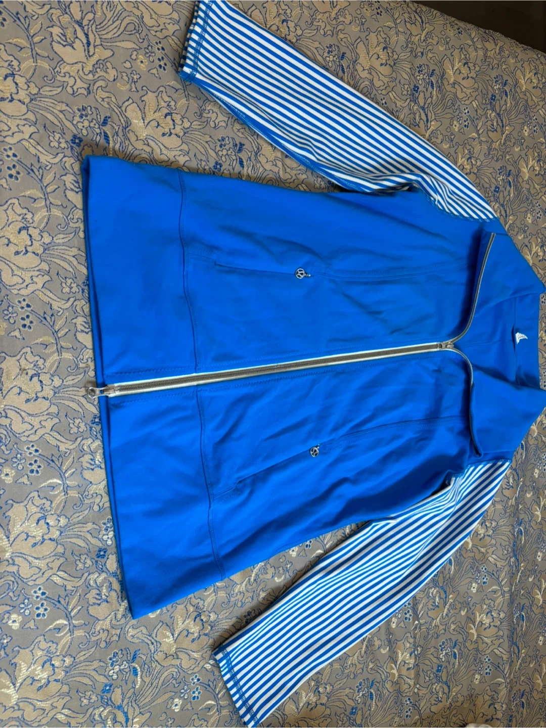 Lululemon Athletica jacket in a vibrant blue! It features stylish striped sleeves.