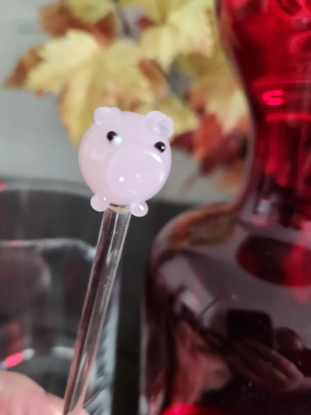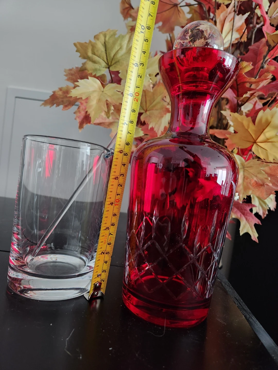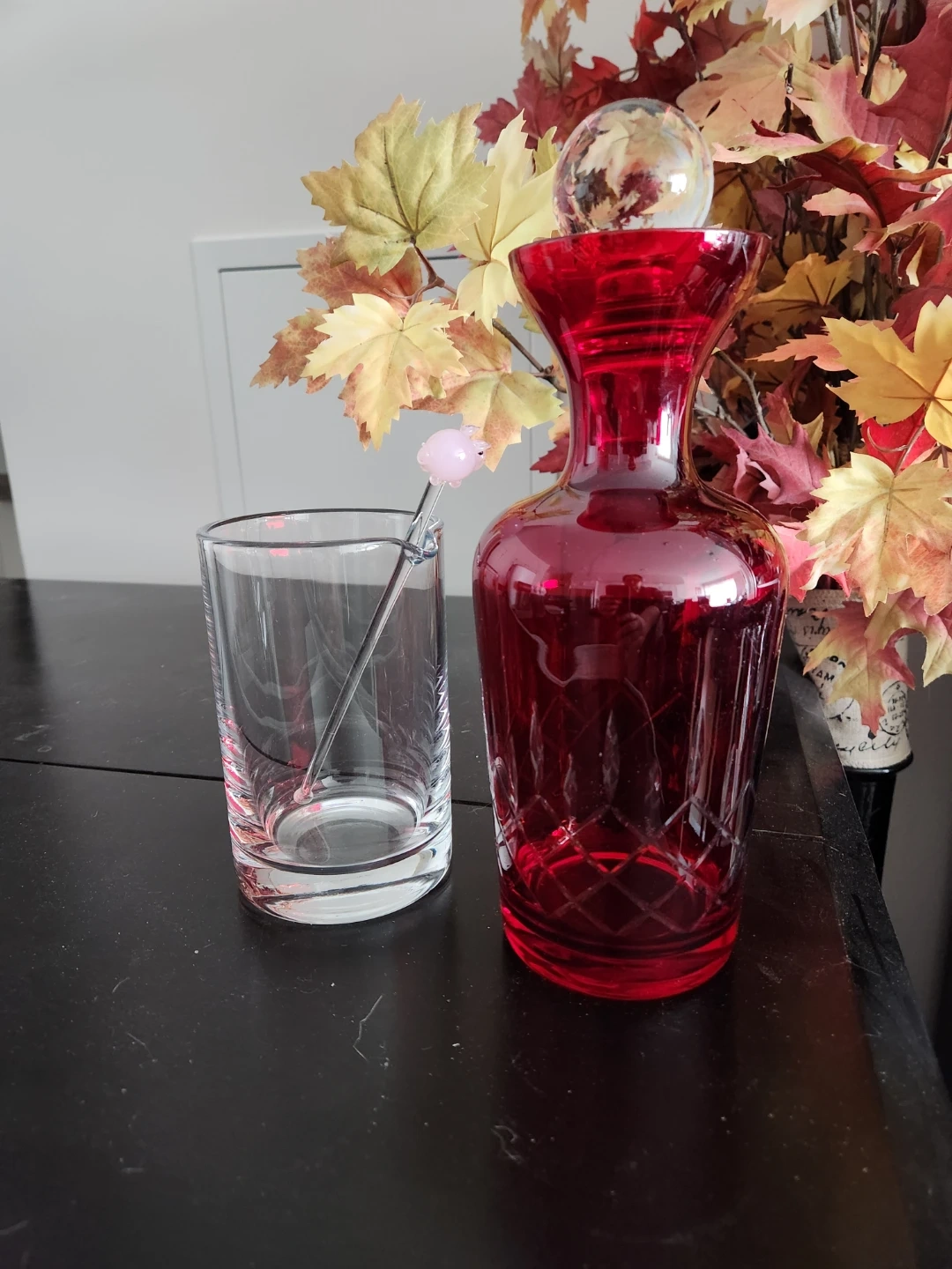 Selling a lovely red glass decanter, perfect for adding a touch of elegance to your home. It comes with a crystal stopper. Also included is a clear glass mixing glass and a glass stirrer with a pink pig detail! No chips or cracks.