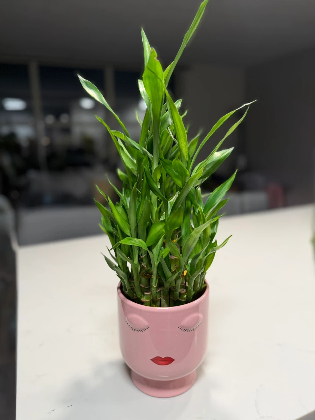 Selling a lucky bamboo plant in a cute pink face pot! It's a great way to add some greenery and a touch of whimsy to your space