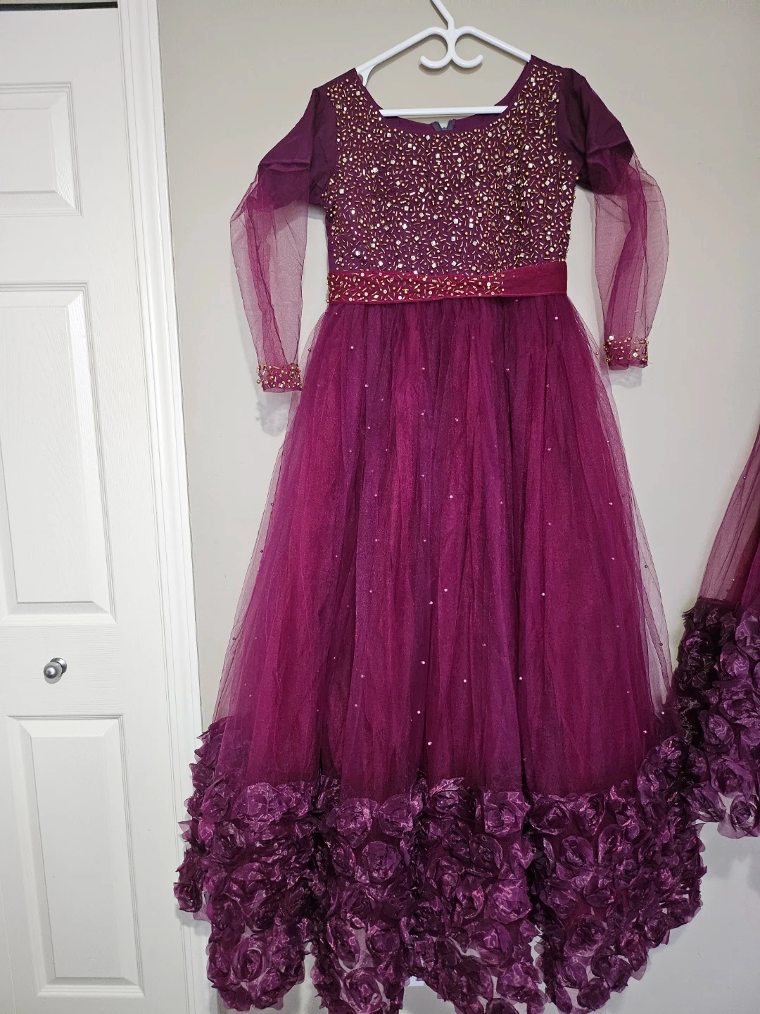 Selling a beautiful purple dress for girls. It features a beaded bodice and a tulle skirt with floral details at the hem. Perfect for parties or special occasions! Mom and daughters combo. You can buy it single pieces as well