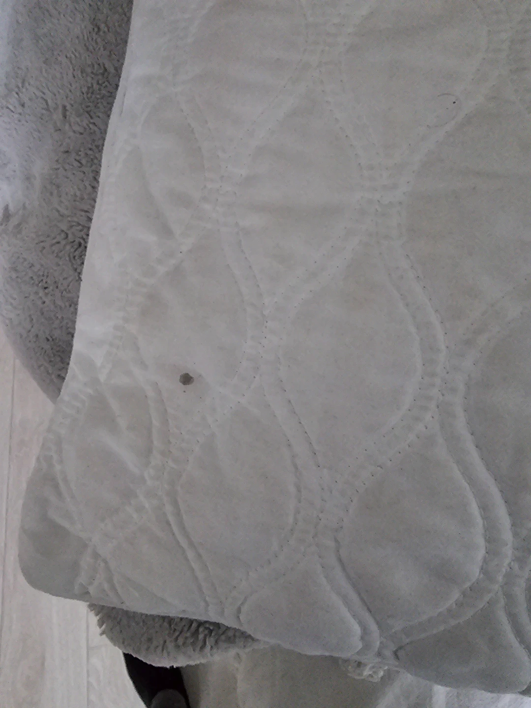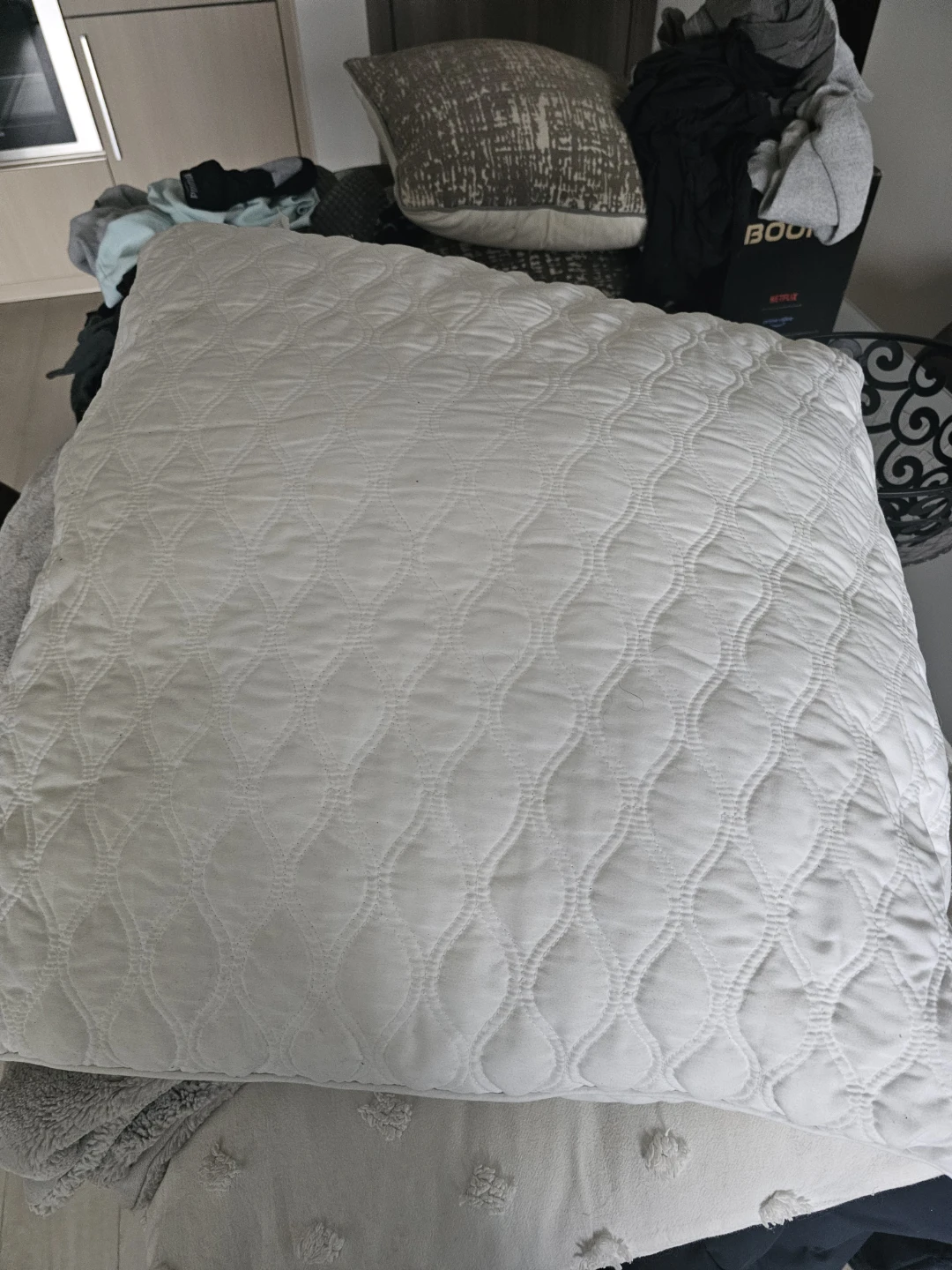 Selling a white quilted throw pillow. It has a subtle pattern and is in good condition. Perfect for adding a cozy touch to your living space! One little mark on the corner might be able to wash out.