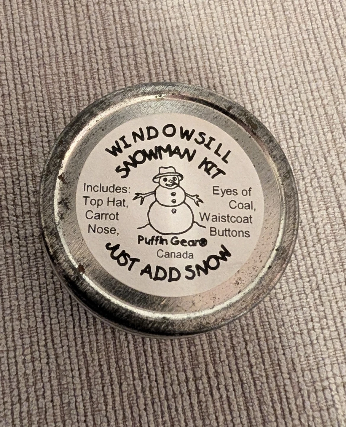 Selling a brand new Puffin Gear Windowsill Snowman Kit! It includes a top hat, carrot nose, eyes of coal, waistcoat buttons, and a tin to hold it all together. Just add snow and you'll have a cute little snowman for your windowsill