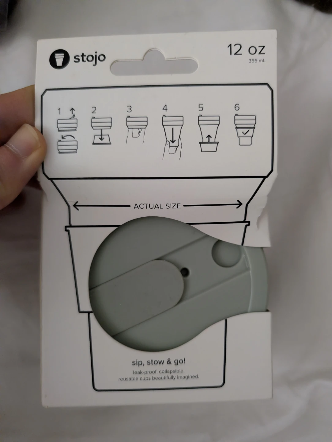 I'm selling a brand new Stojo Collapsible Cup! This cup is perfect for anyone looking to reduce their use of disposable cups. It's gray, holds 12 oz / 355 mL, and collapses for easy storage. It's leak-proof, stowable, and reusable. Get yours today!