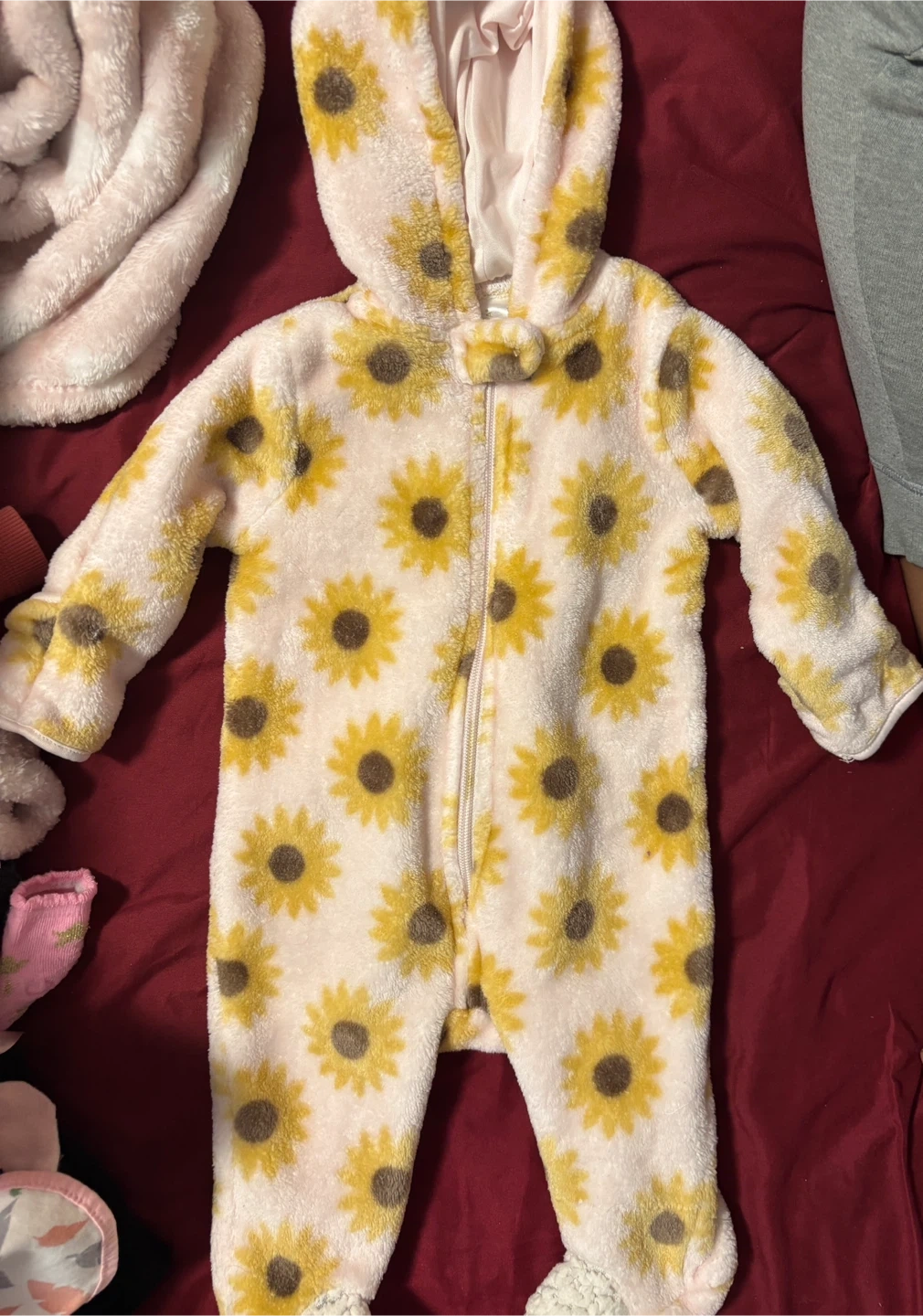 Here's an adorable sunflower-patterned baby onesie! It's perfect for keeping your little one cozy and cute. The onesie has a hood and a zipper for easy dressing. It's in great condition and ready for a new home!