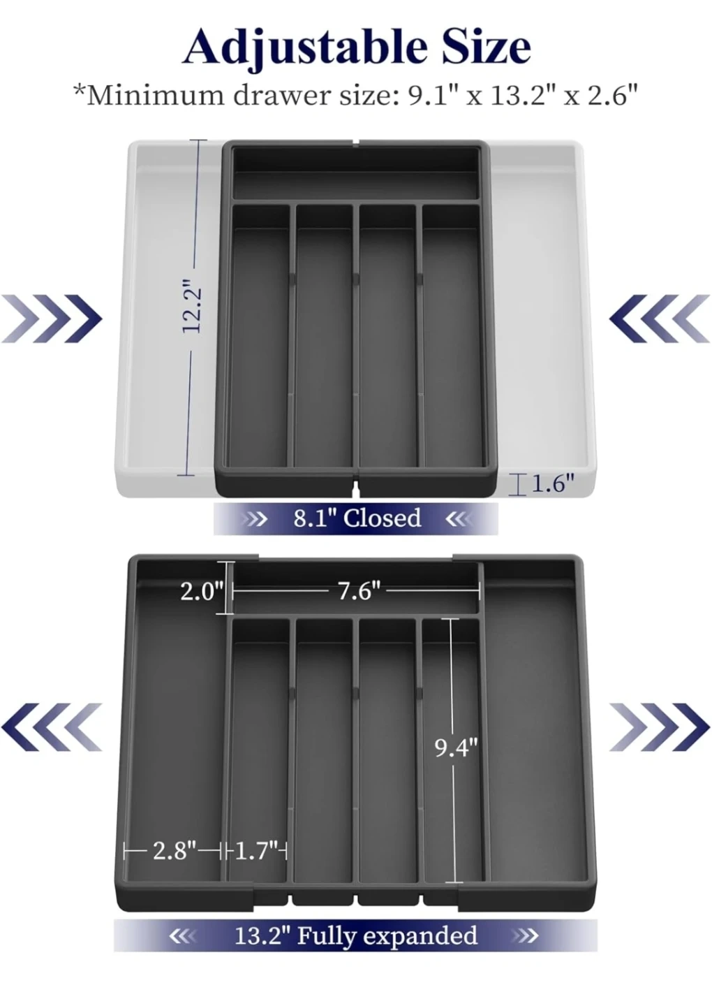 - Adjustable size: Minimum drawer size is 9.1" x 13.2" x 2.6", fully expanded size is 13.2" x 12.2" x 1.6"
