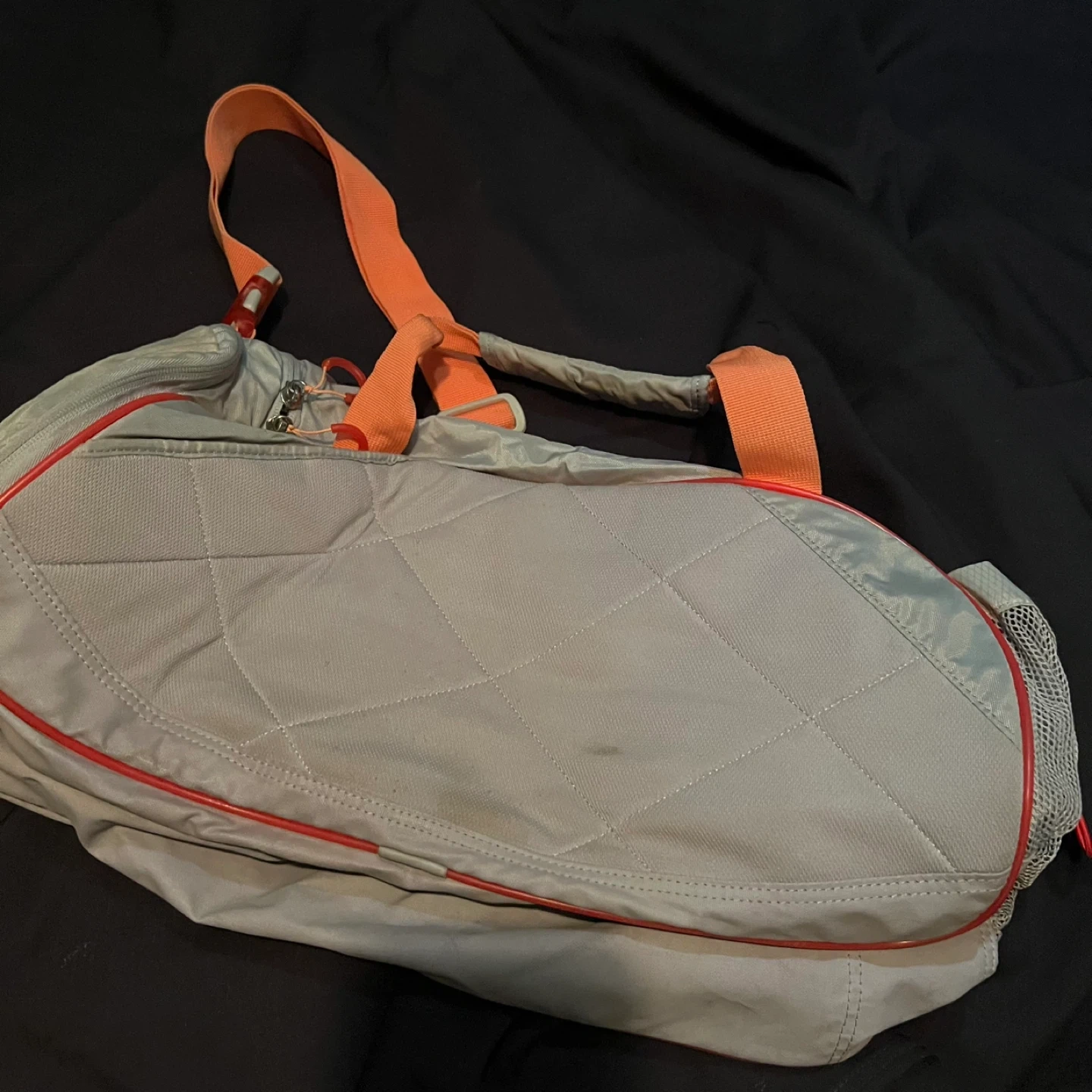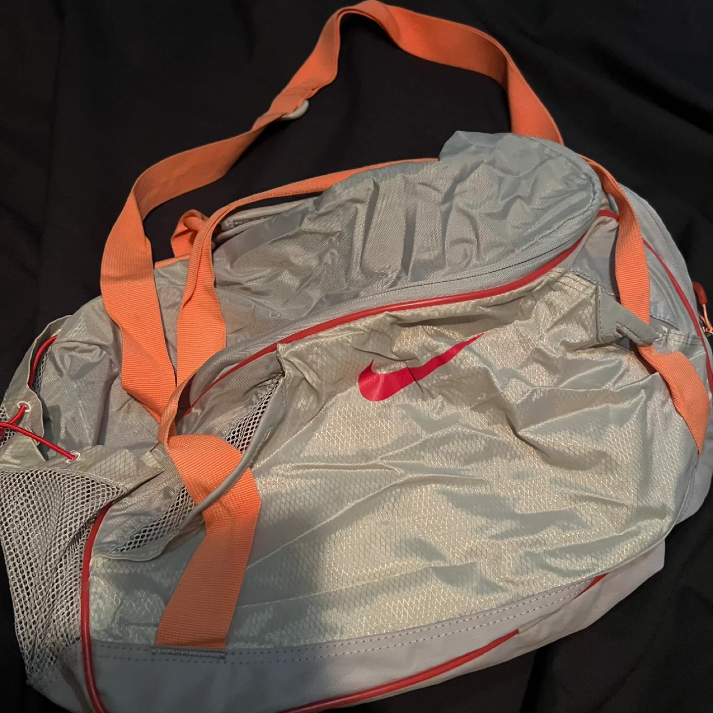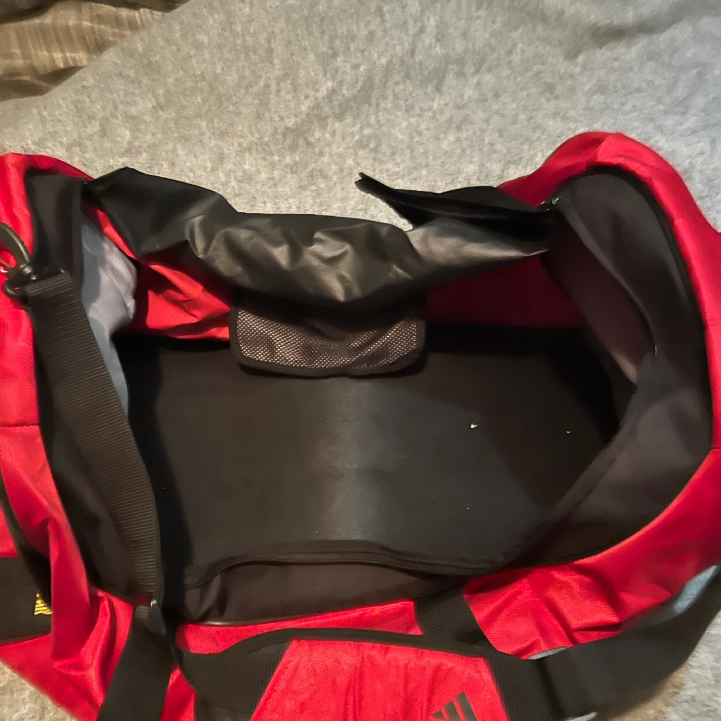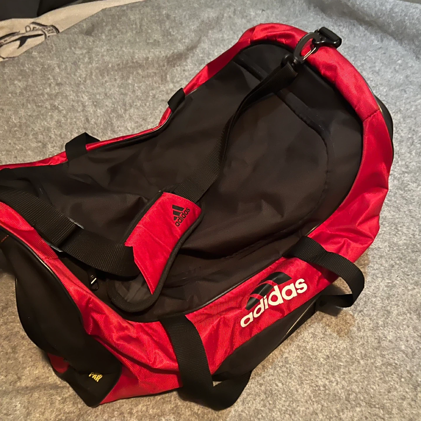 Used not a few times NEXT TO NEW JUMBO BAG. Adidas duffle bag in red and black! It's in great shape and has plenty of room for all your gear. Measures approximately 28 inches long and 12 inches wide. Comes with FREE NIKE SMALLER DUFFLE BAG.