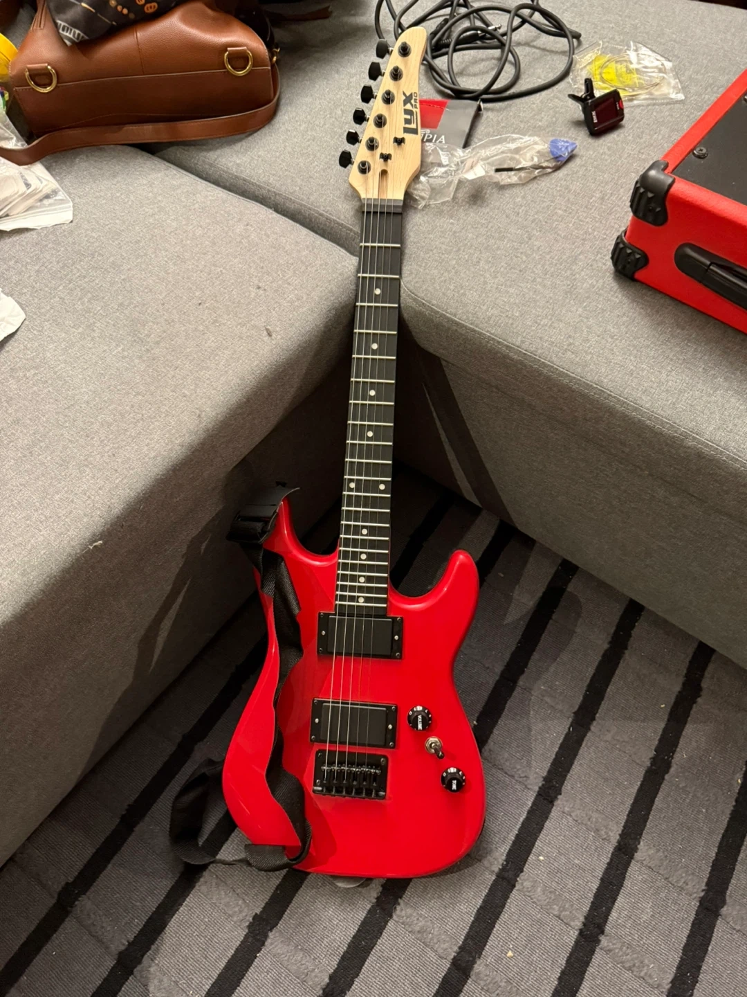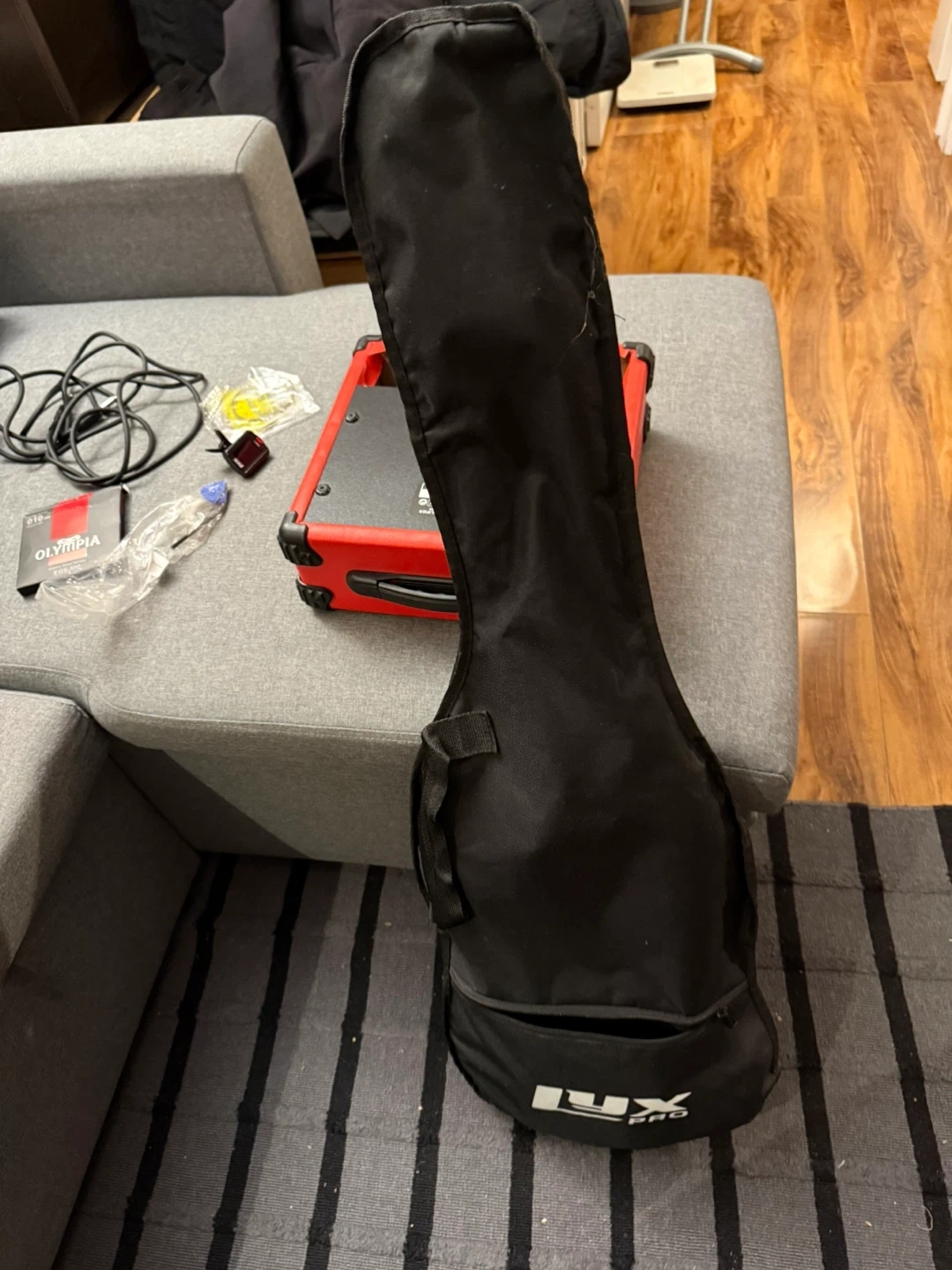 Selling a Lux Pro electric guitar with a bright red finish! It comes with an AGL-20 amplifier, also in red, so you're ready to rock right away. Also included is a guitar case, cable, and Olympia EGS-500 strings!