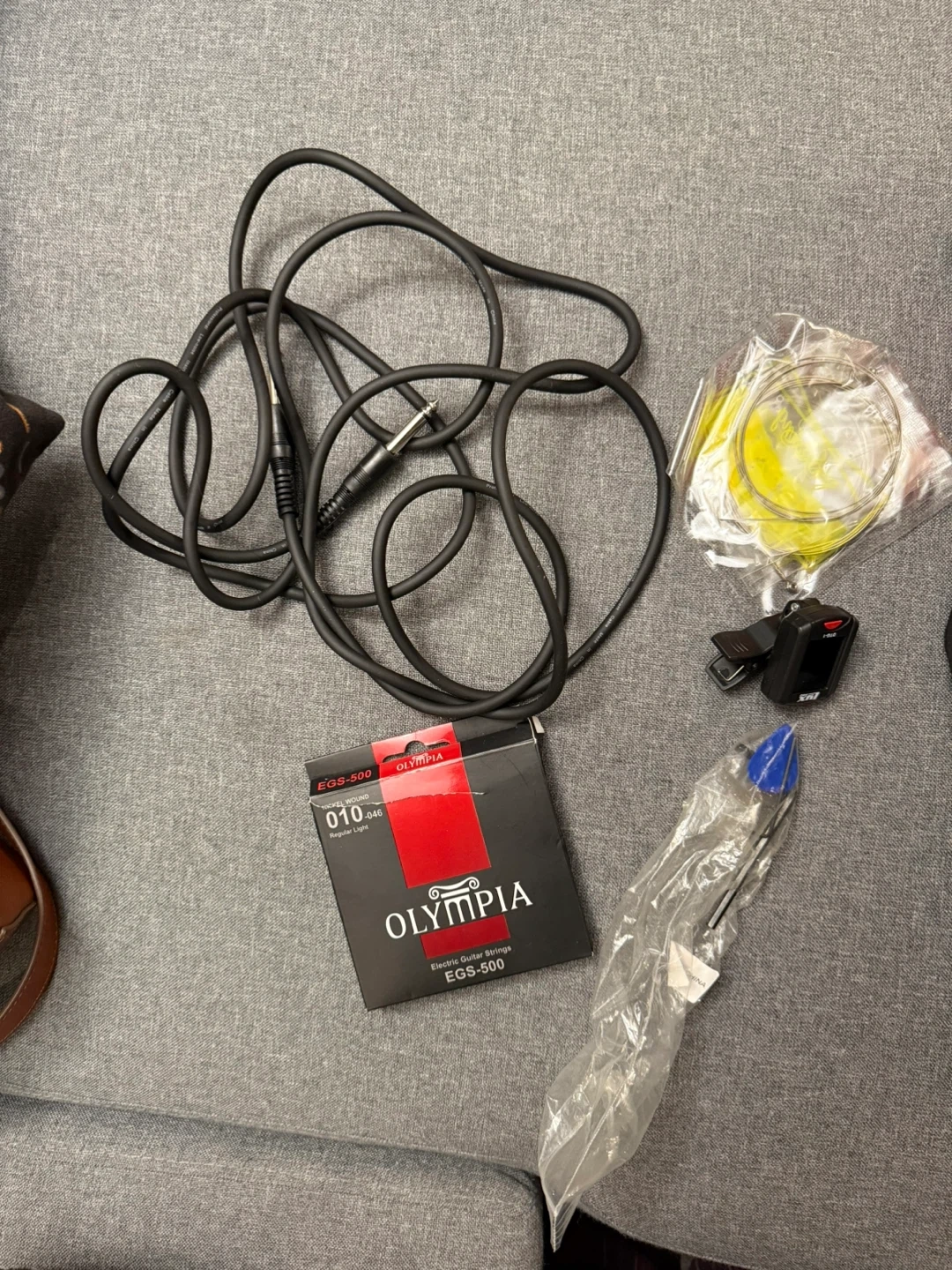 Selling a Lux Pro electric guitar with a bright red finish! It comes with an AGL-20 amplifier, also in red, so you're ready to rock right away. Also included is a guitar case, cable, and Olympia EGS-500 strings!