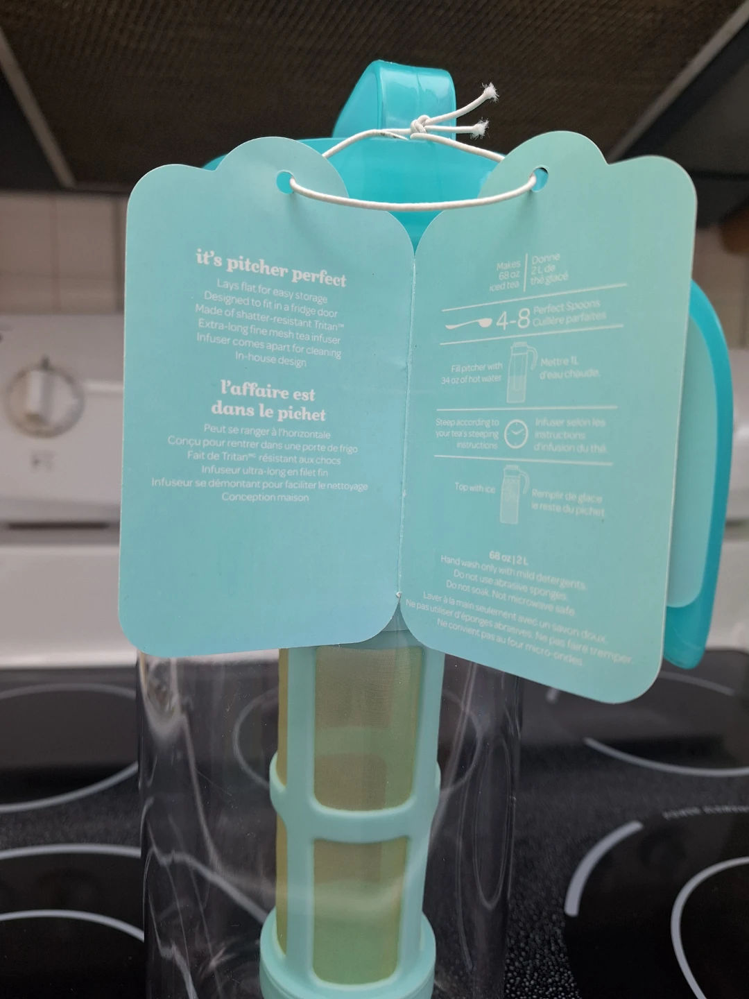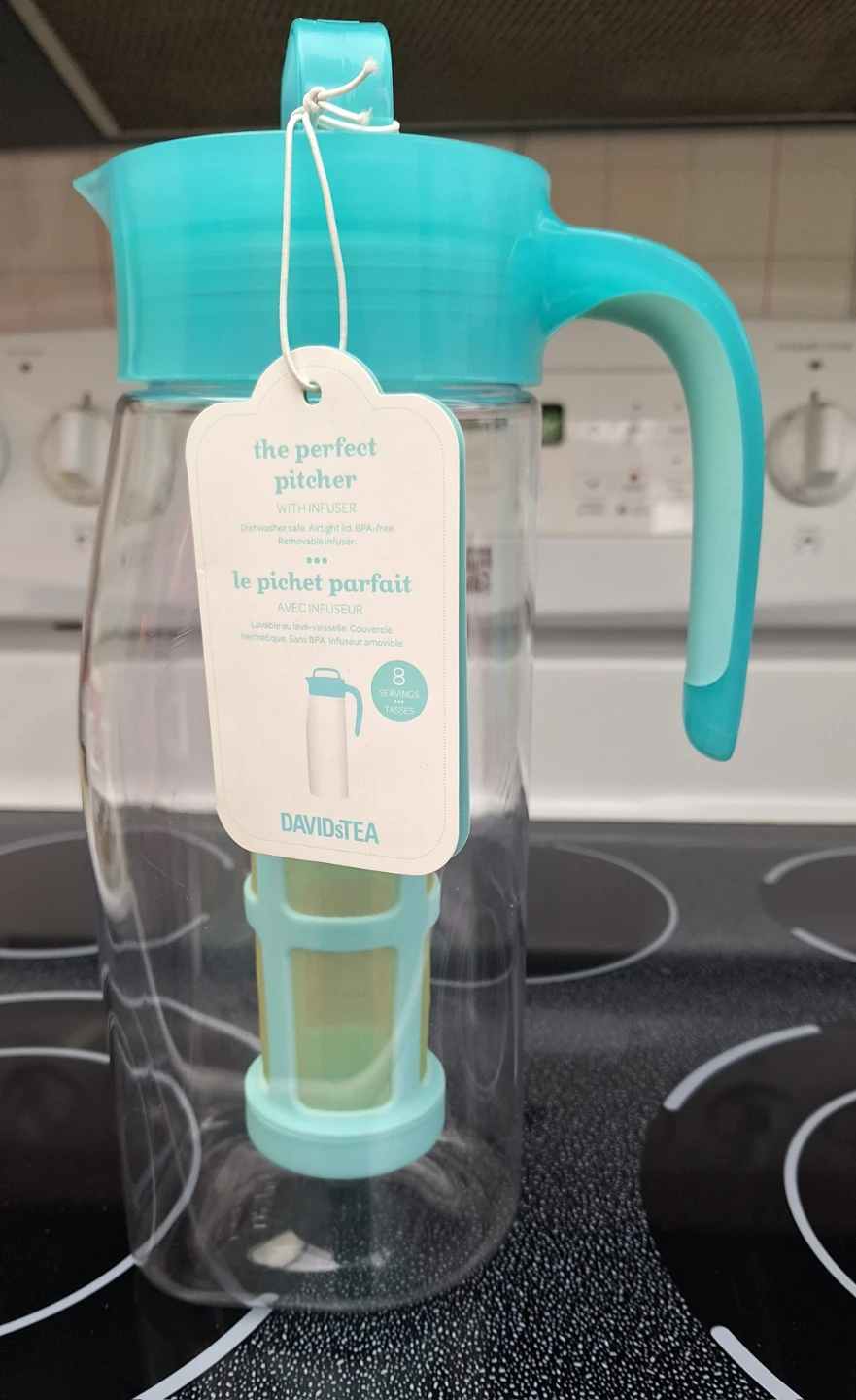 DAVIDsTEA The Perfect Ice Tea Pitcher with Infuser. Makes 8 servings, holds 68 oz./2 L. Slim design to fit in a fridge door.