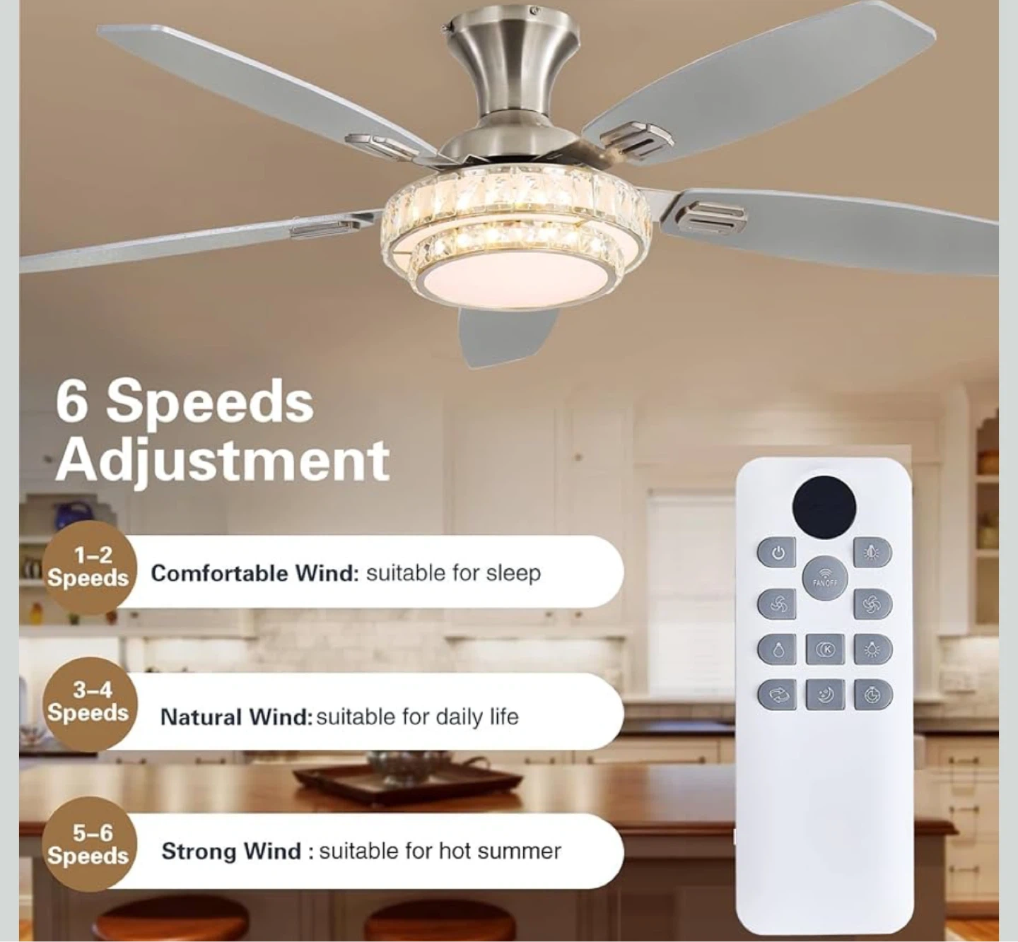This is a beautiful crystal ceiling fan that will add a touch of elegance to any room. It comes with a remote control for easy operation and has 6-speed adjustments to suit your needs. You can choose from a comfortable wind for sleep, a natural wind for daily life, or a strong wind for hot summer days