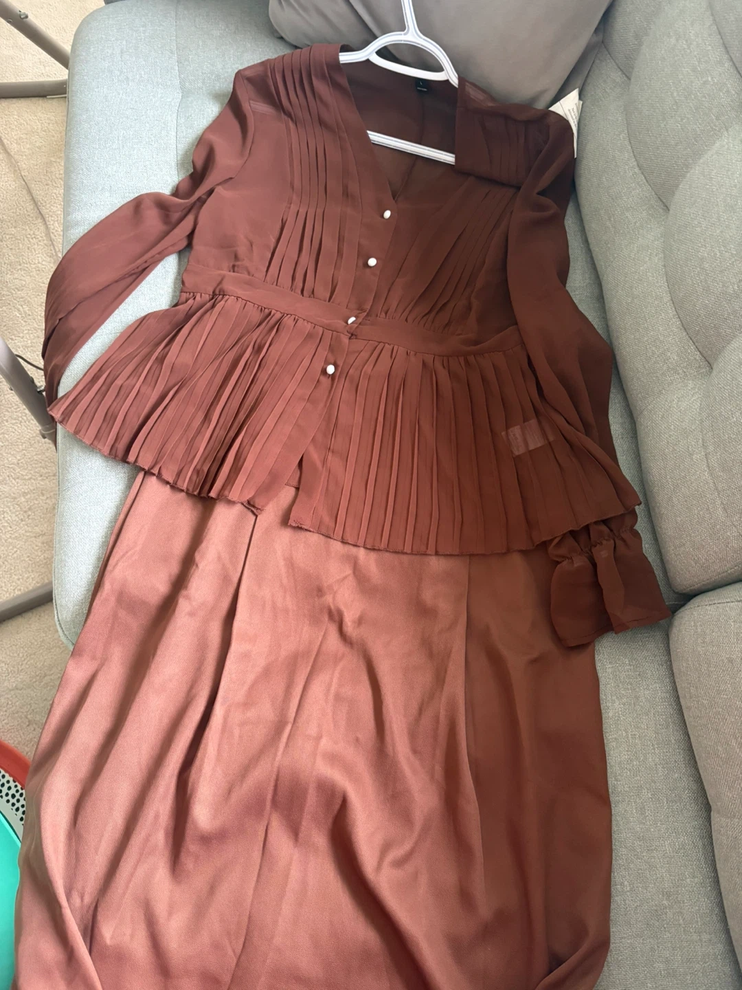 Selling a cute brown pleated skirt and blouse set! The blouse has a V-neck and button-up front, with pleated detailing. The skirt is a midi length and also has pleated accents. Perfect for a stylish, put-together look!