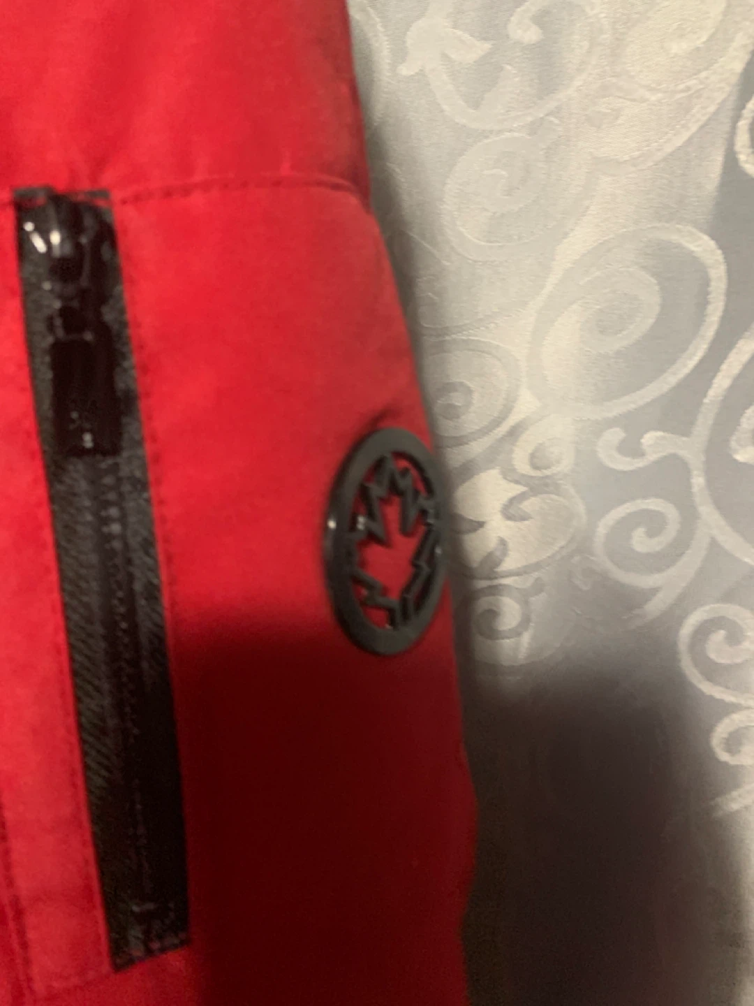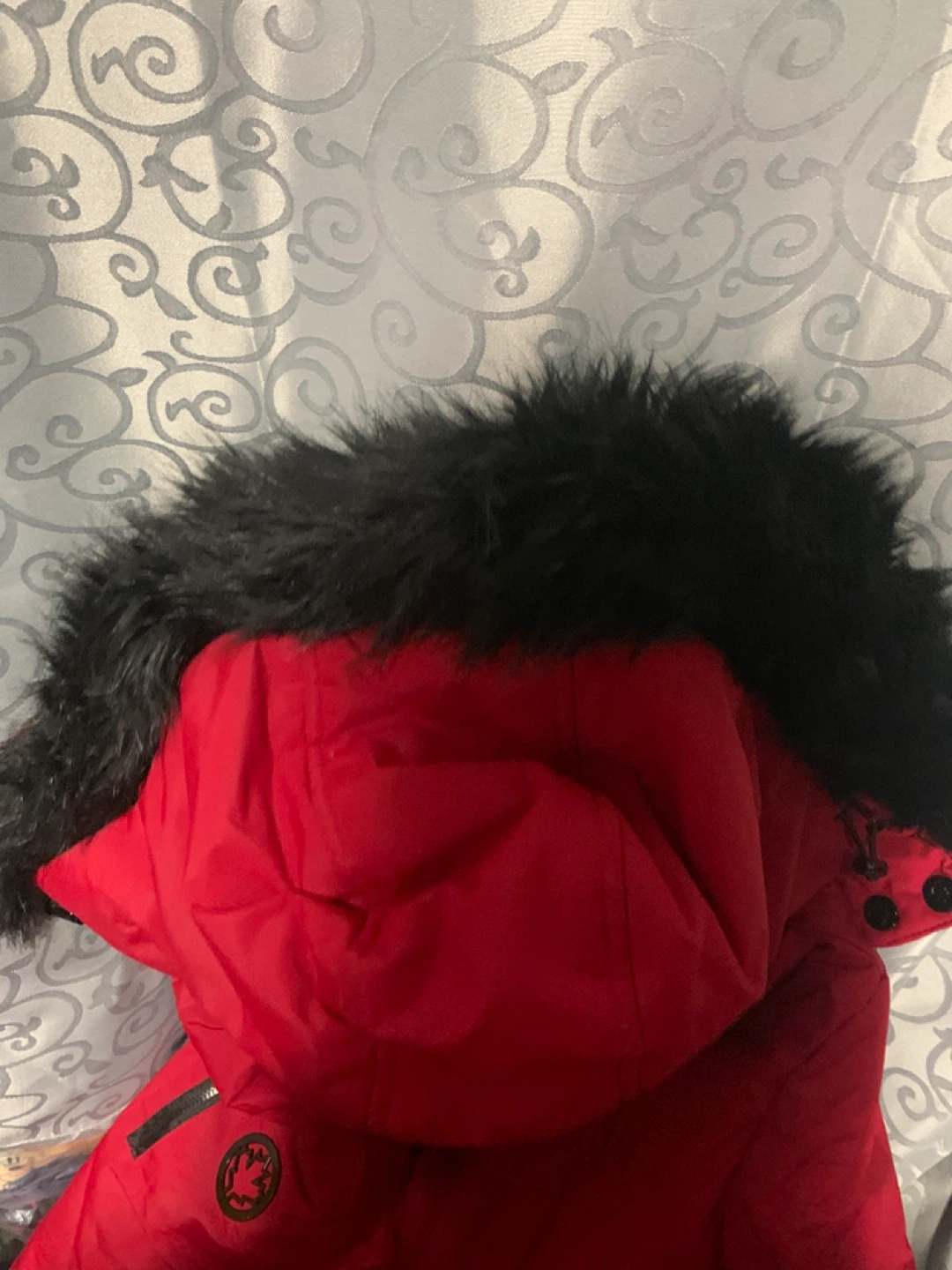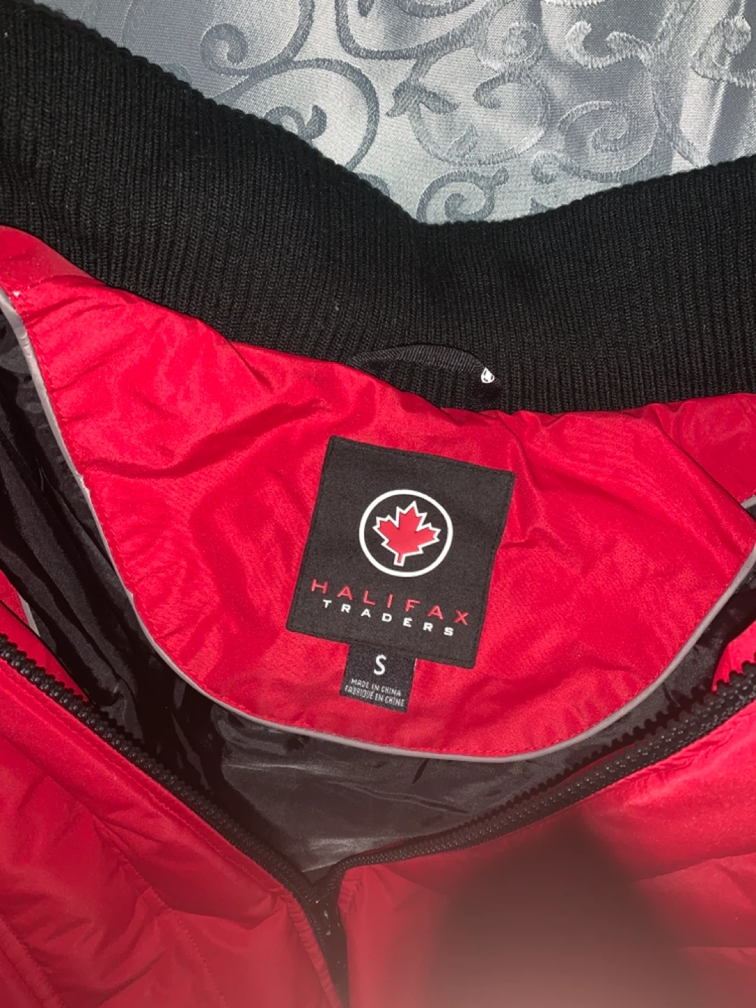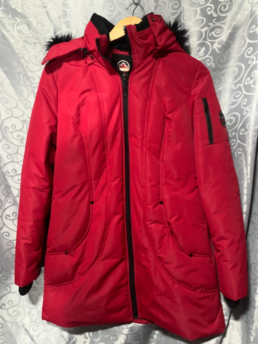 I'm selling a red winter coat from Halifax Traders. It's a size small and in great condition. It has a faux fur trim on the hood and a maple leaf logo on the sleeve. Perfect for the Canadian winter!