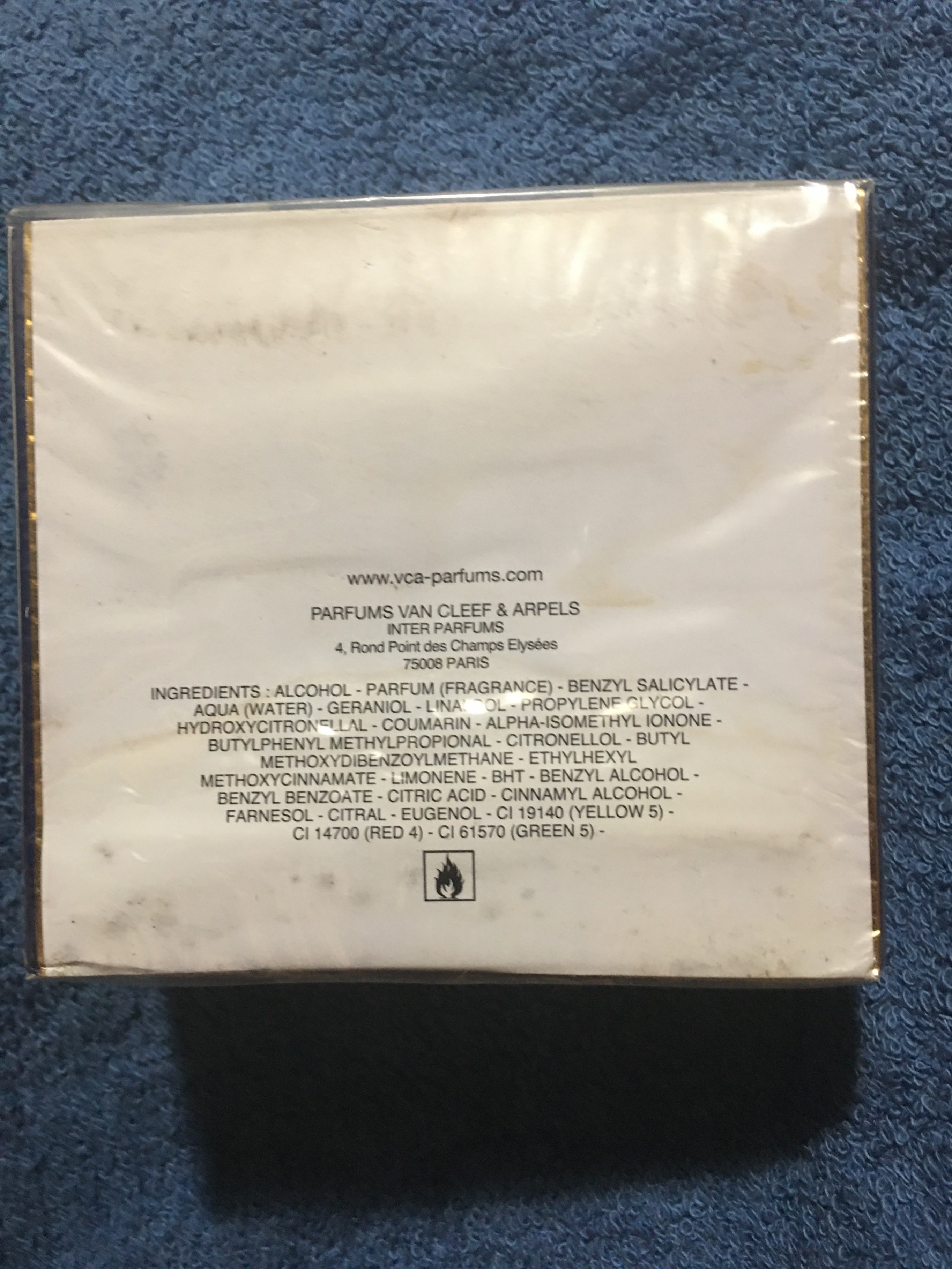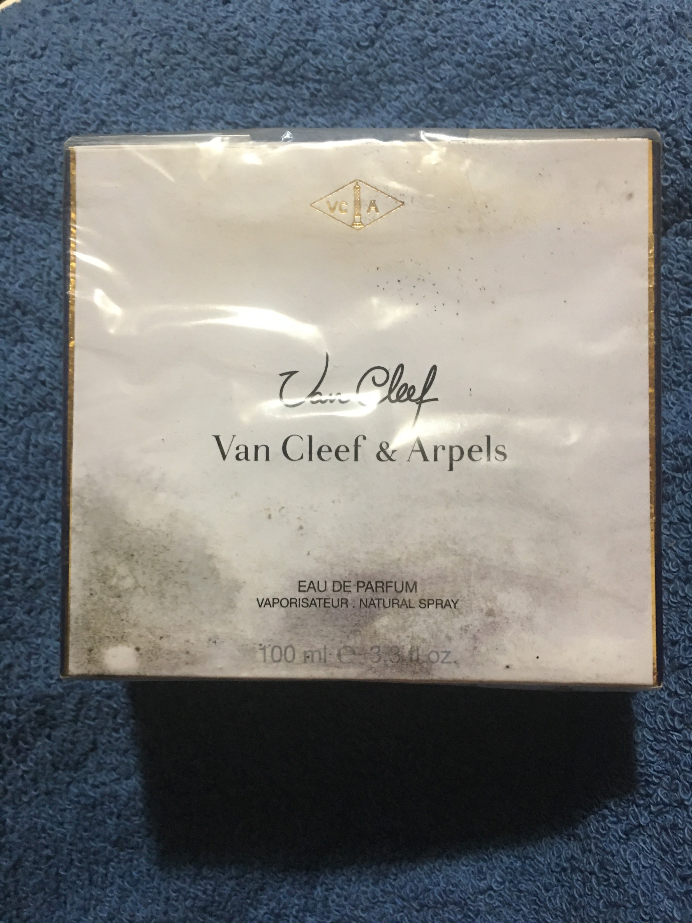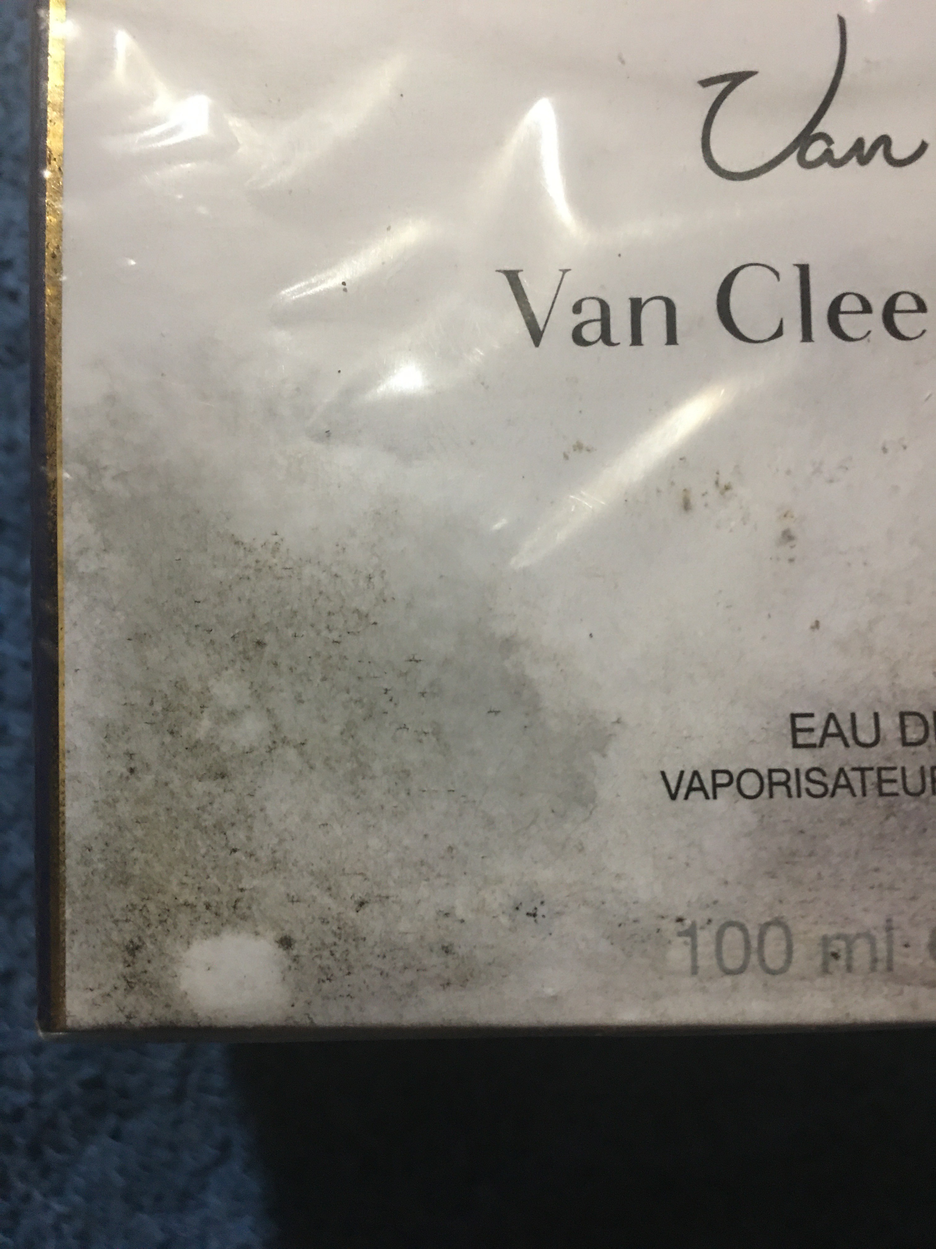 Selling a Van Cleef & Arpels Eau de Parfum. It's a 100ml vaporisateur natural spray. The box is included! I'm not sure what happened to this but please look at the photos as it did get what looks like mold damage but it still is brand new never opened Only the box is damaged as something leaked onto it