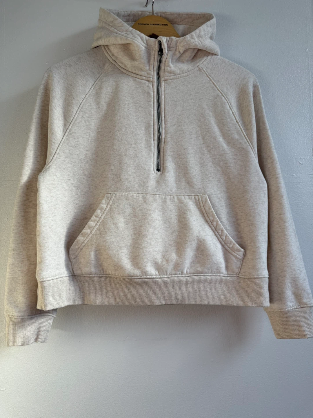 Cozy up in this cream-coloured half-zip It's perfect for layering or just lounging around the house. The hoodie features a convenient front pocket and a comfortable fit.