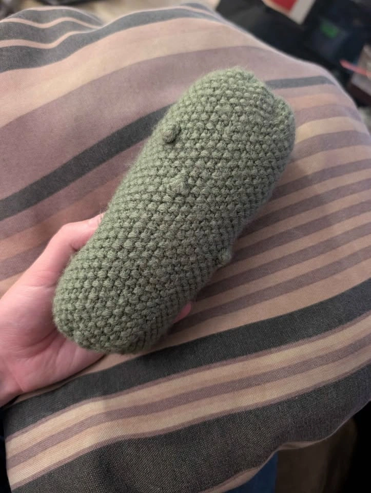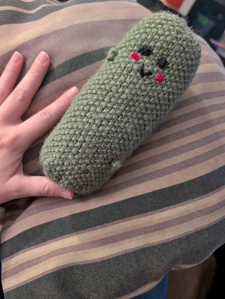 This handmade knitted Pickle Pal is the perfect companion! Whether you are in need of a tag-along for a little one, or emotional support for yourself, your Pickle Pal is there with you.