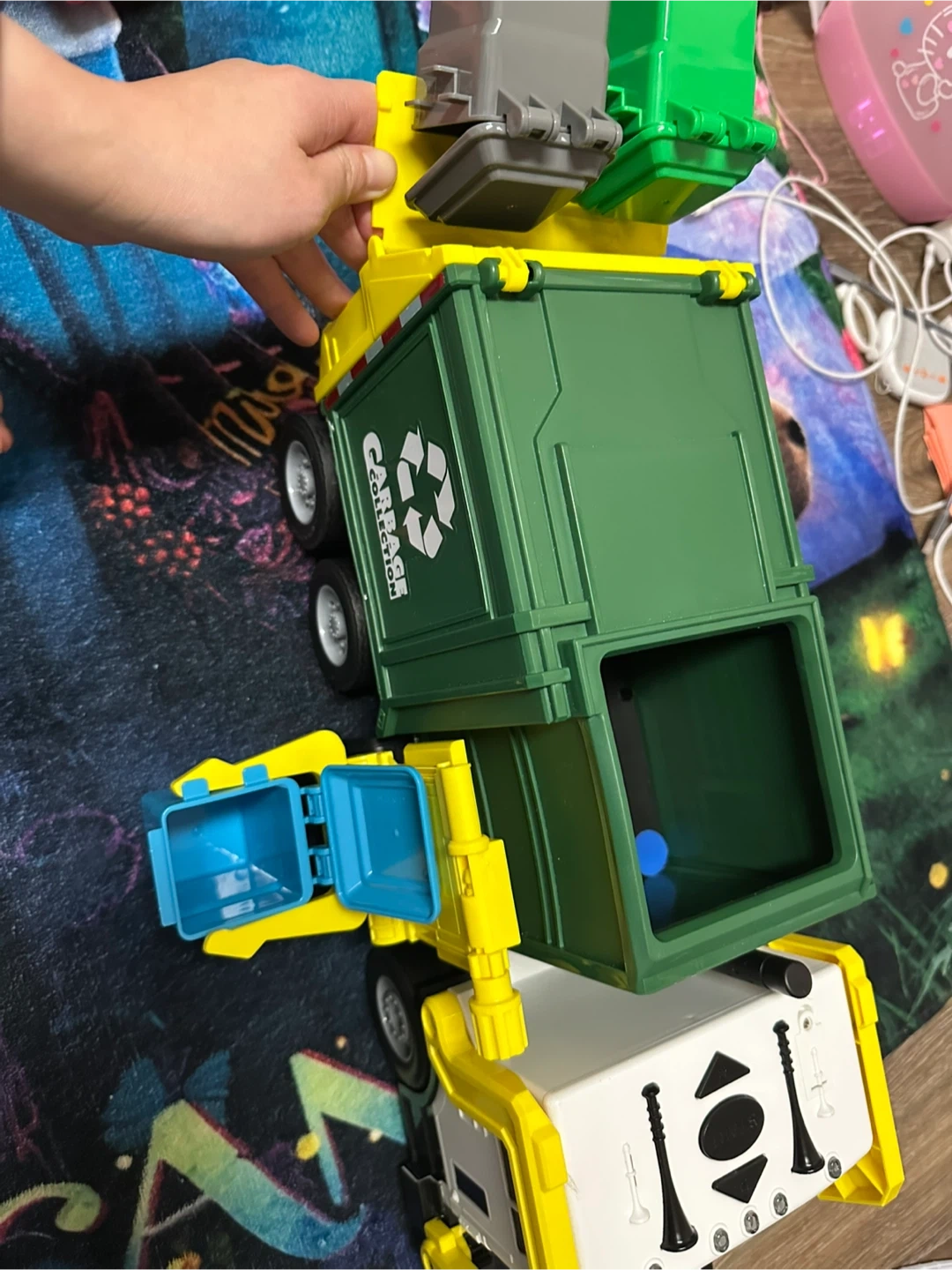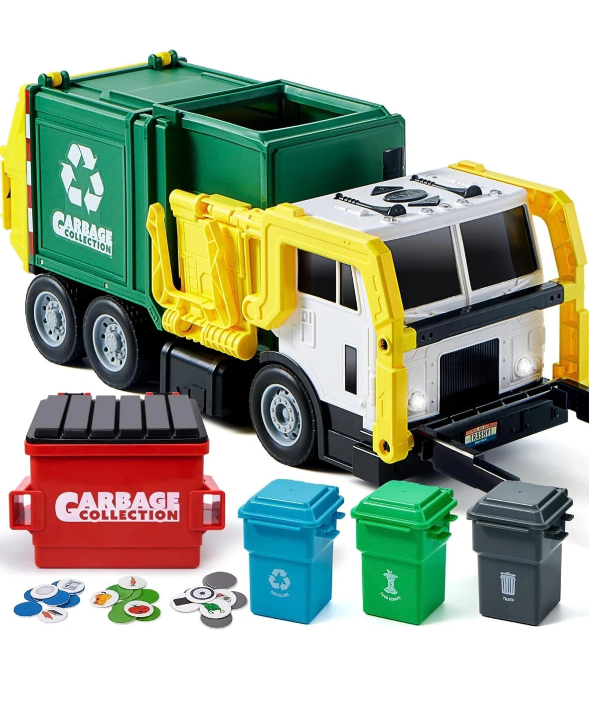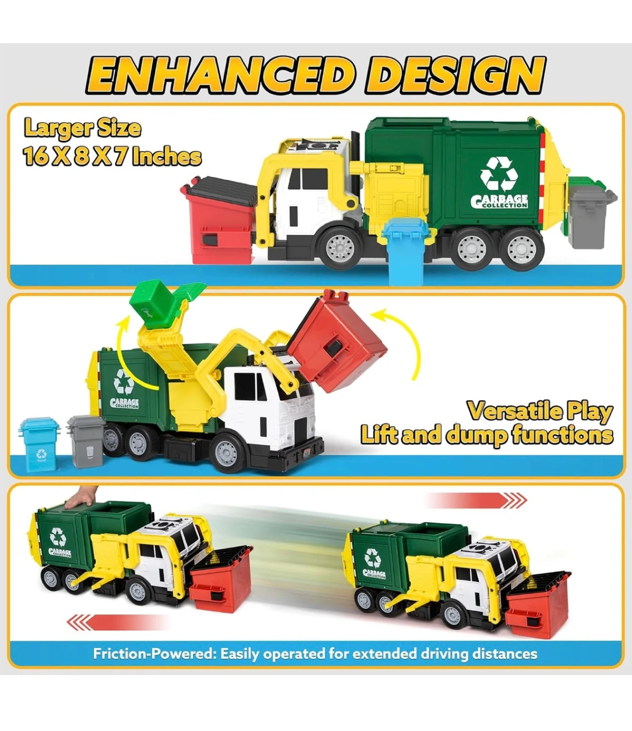 This Garbage Collection Truck toy is perfect for kids who love vehicles! It features realistic lights and sounds, a flip truck container, and a side trash lifting function. The set includes 1 dumpster, 3 trash bins, and 30 trash cards. The truck also has a trunk loading function and simulated LED headlights. Enhanced design with a larger size, measuring 16 x 8 x 7 inches. Friction-powered for easy operation and extended driving distances!