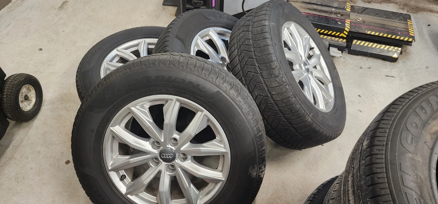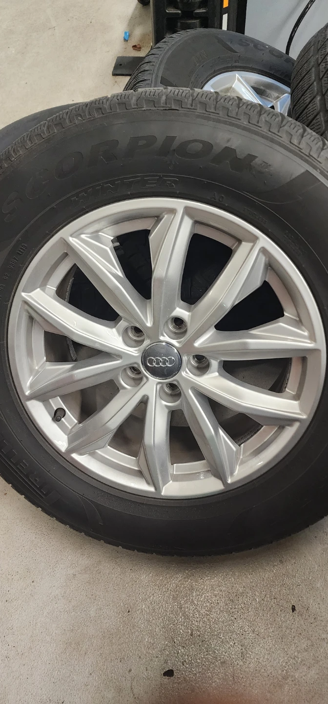Selling OEM Audi rims with Pirelli Scorpion Winter tires. Tire size 235/65R17 104H. DOT 1119. Tires have about 3MM tread left, have 1 more season on them but I do recommend getting new Winter tires. Rims have minor scratches from wear and tear. Came off 2019 Audi Q5. **Rims DO NOT have TPMS sensors**