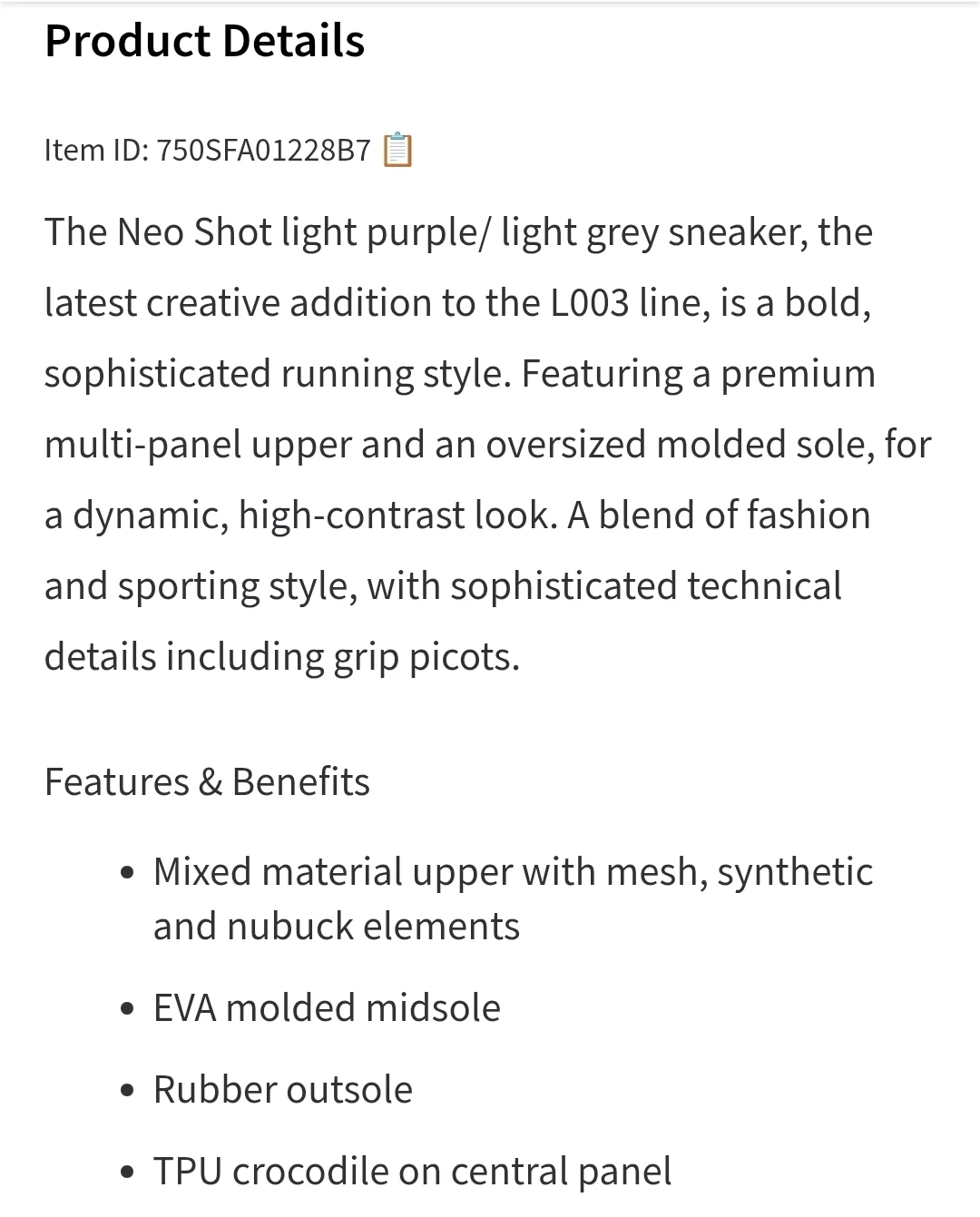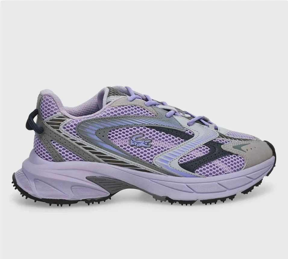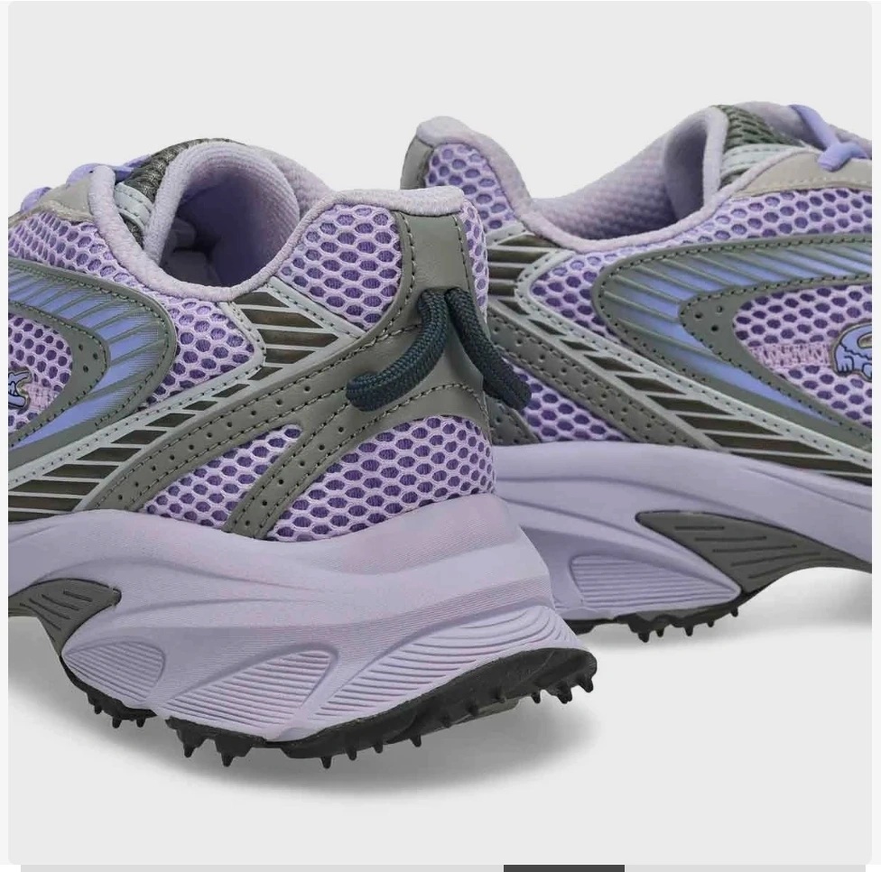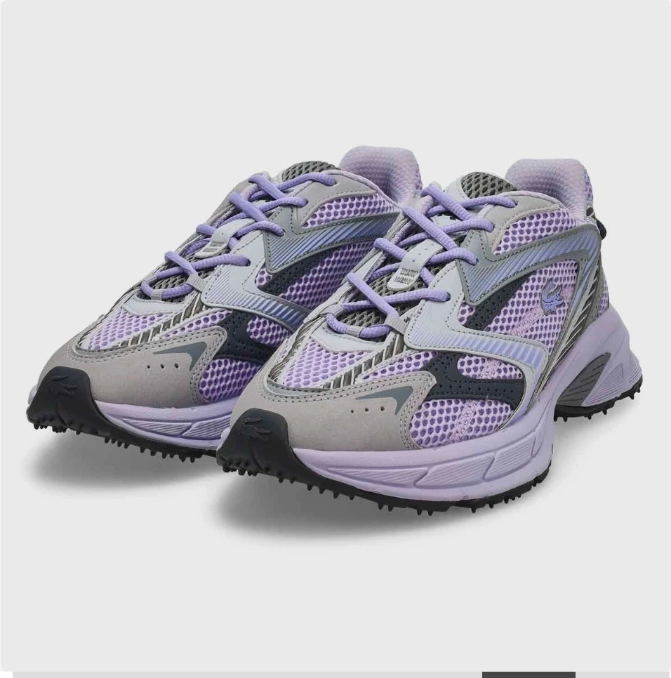 Selling a pair of Lacoste NEO SHOT women's sneakers in a lovely light purple and light grey colour combination! These sneakers are a bold and sophisticated running style, part of the L003 line. They feature a premium multi-panel upper and an oversized molded sole for a dynamic, high-contrast look. The upper is made of mixed materials with mesh, synthetic, and nubuck elements. They also have an EVA molded midsole, a rubber outsole, and a TPU crocodile on the central panel