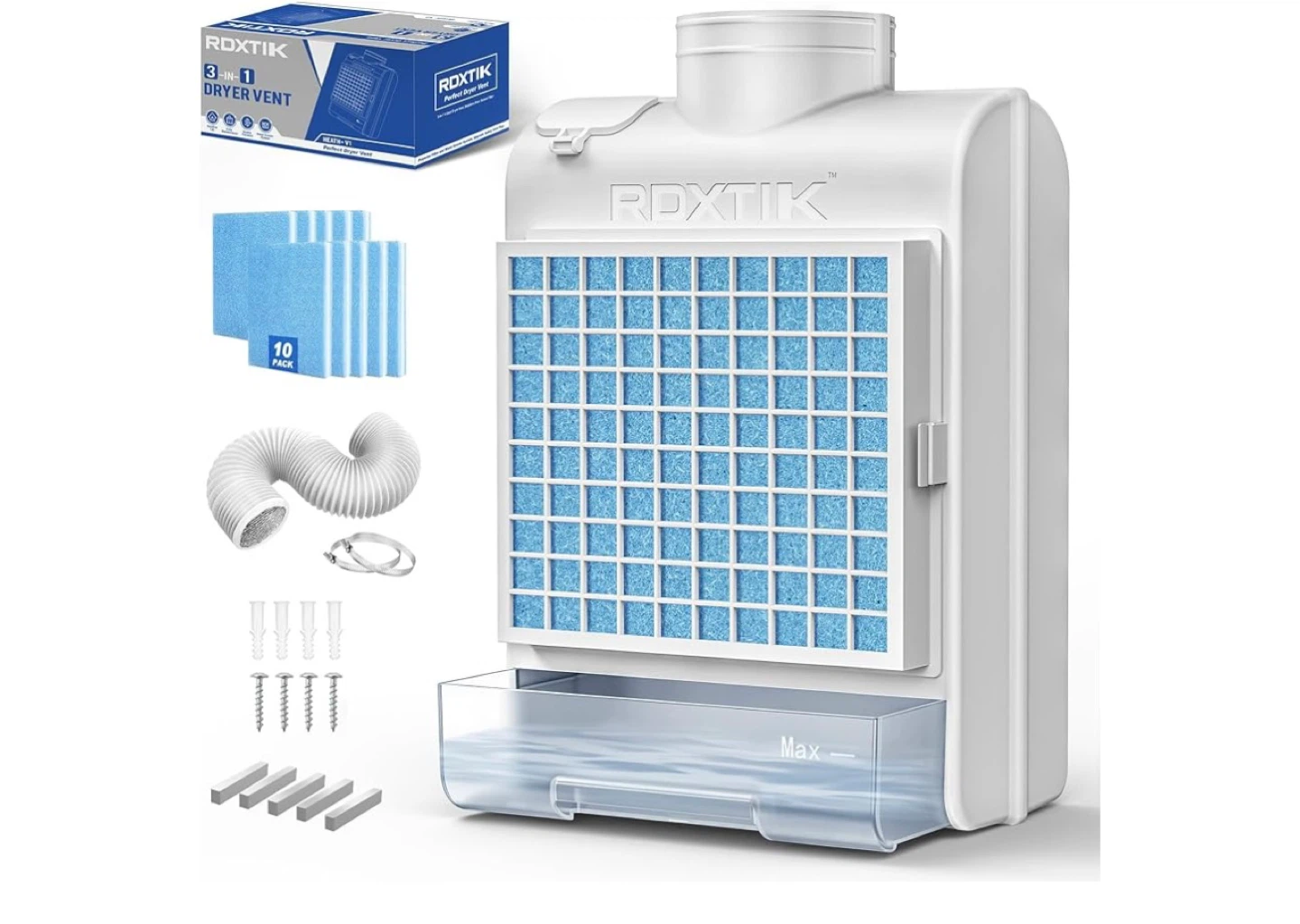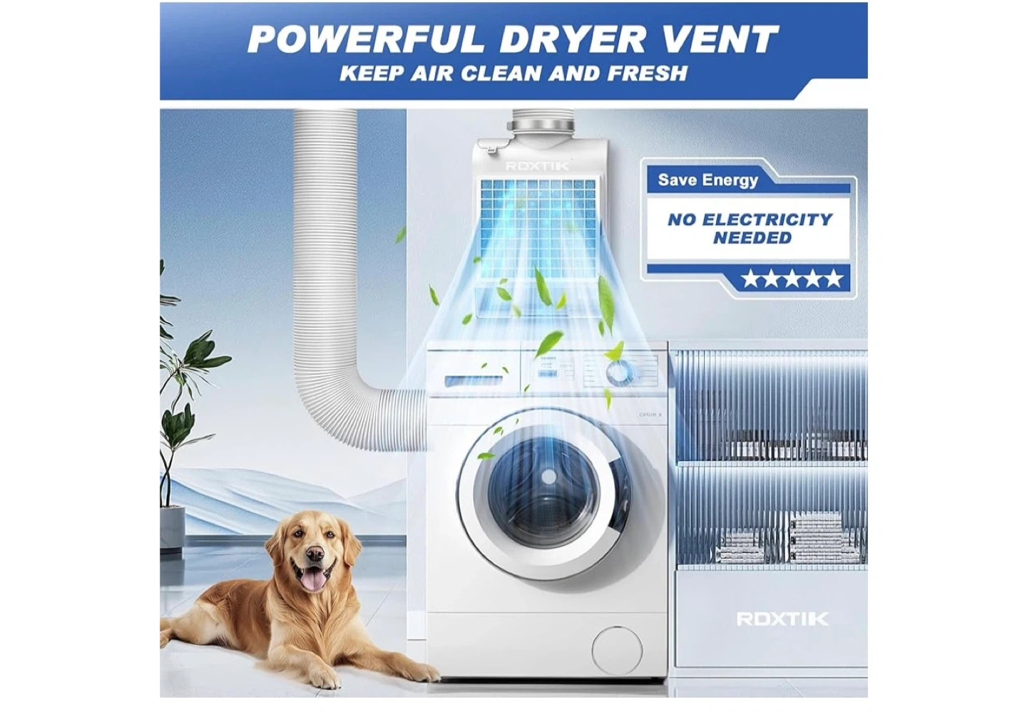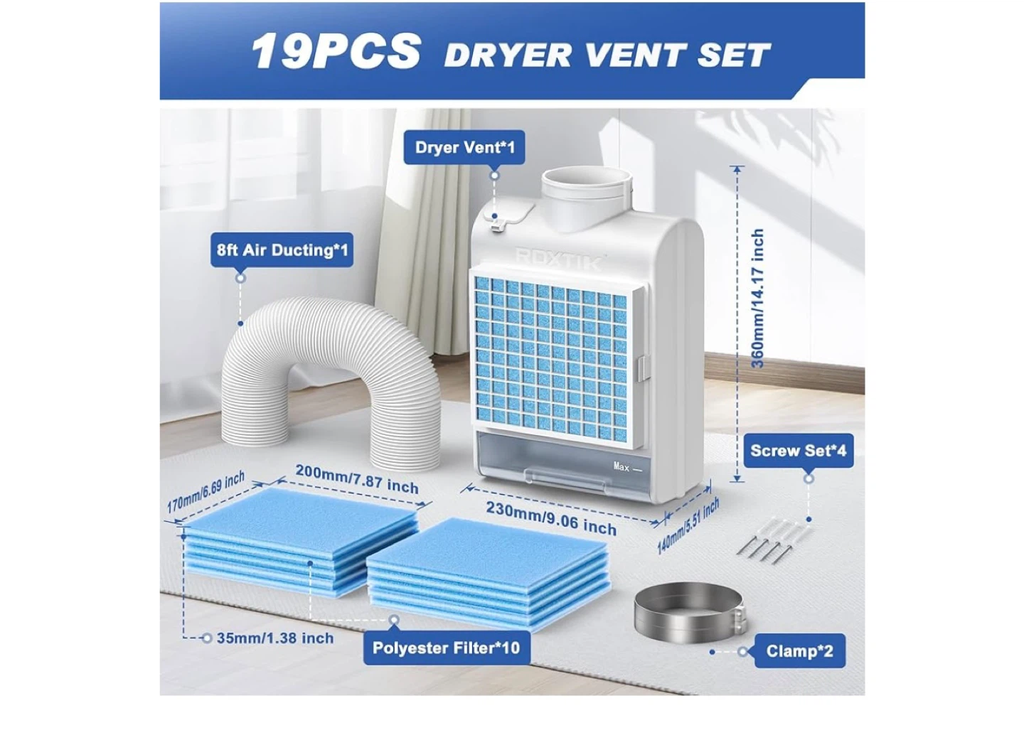 I have a new ROXTIK 19PCS Dryer Vent Set for sale! This powerful dryer vent helps keep air clean and fresh, and can save energy since no electricity is needed. It includes a dryer vent, 8ft air ducting, a screw set, clamp, and polyester filters. Get yours today!