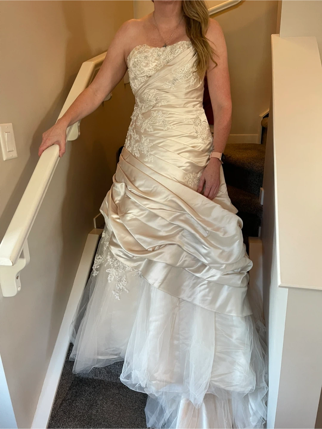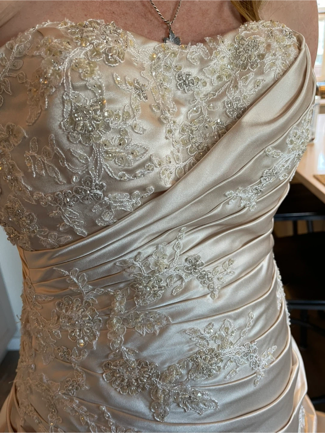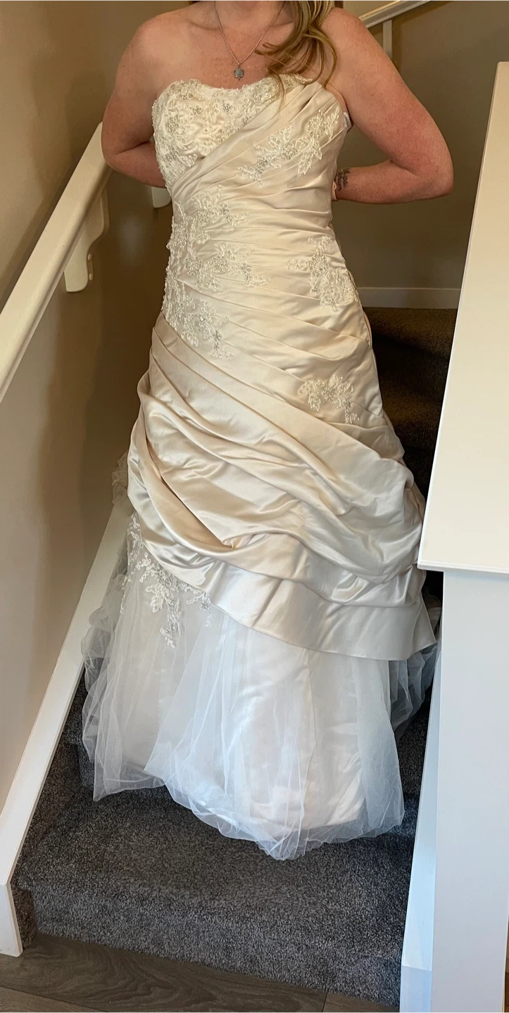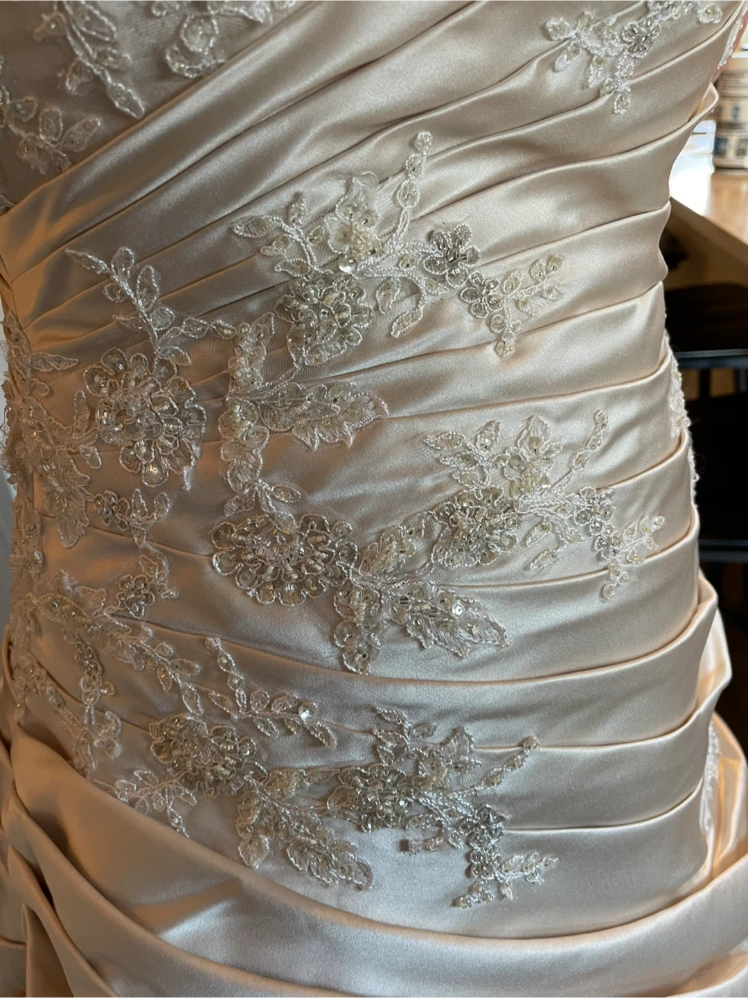 Selling a beautiful wedding dress in a champagne colour! It has a strapless design with delicate floral and bead detailing on the bodice. The dress features a layered skirt with a tulle overlay, creating a romantic and elegant look. It's in great condition and ready for its special day. Altered to a size 4.