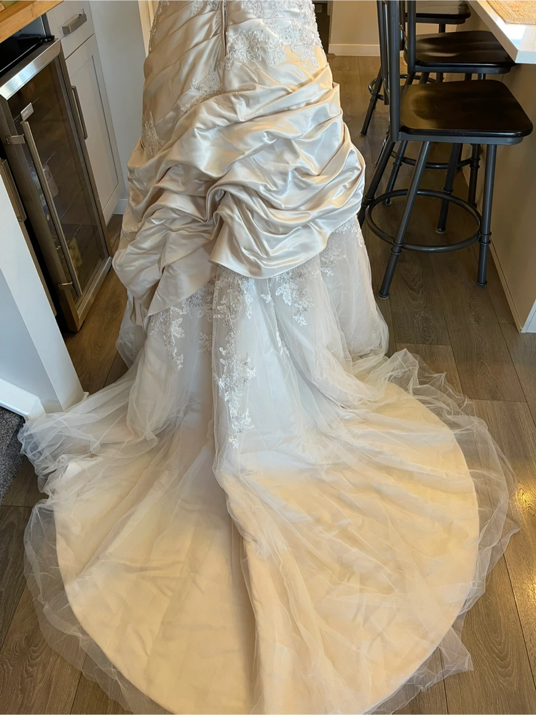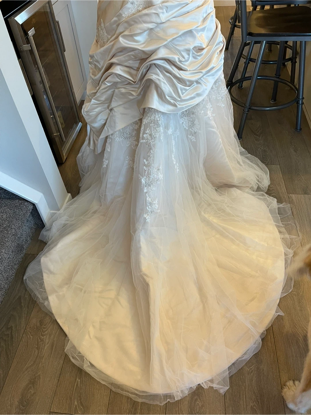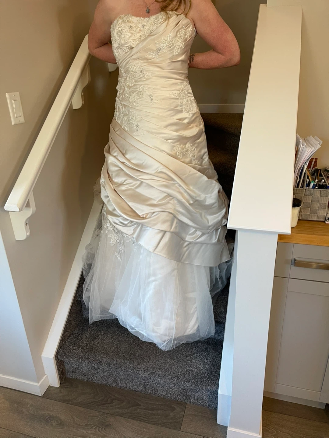 Selling a beautiful wedding dress in a champagne colour! It has a strapless design with delicate floral and bead detailing on the bodice. The dress features a layered skirt with a tulle overlay, creating a romantic and elegant look. It's in great condition and ready for its special day. Altered to a size 4.