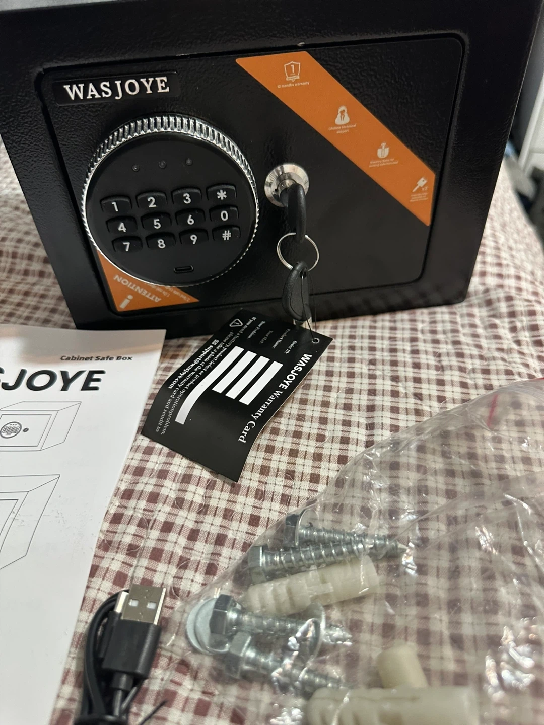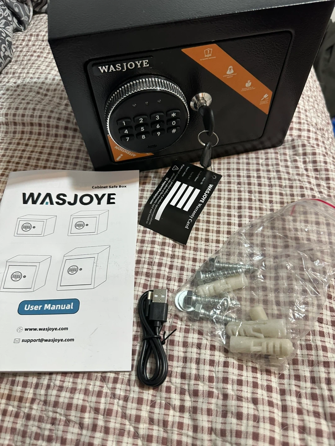 Selling a WASJOYE cabinet safe box brand new! It comes with the user manual, warranty card, USB cable, and a bag of screws and wall anchors. Perfect for keeping your valuables secure!