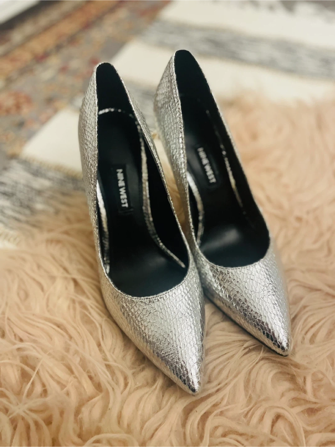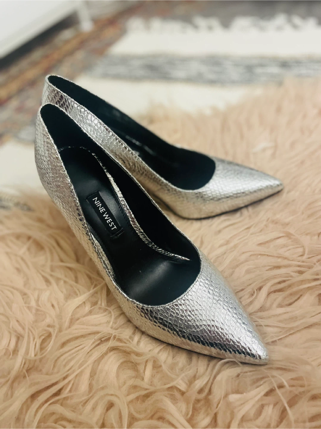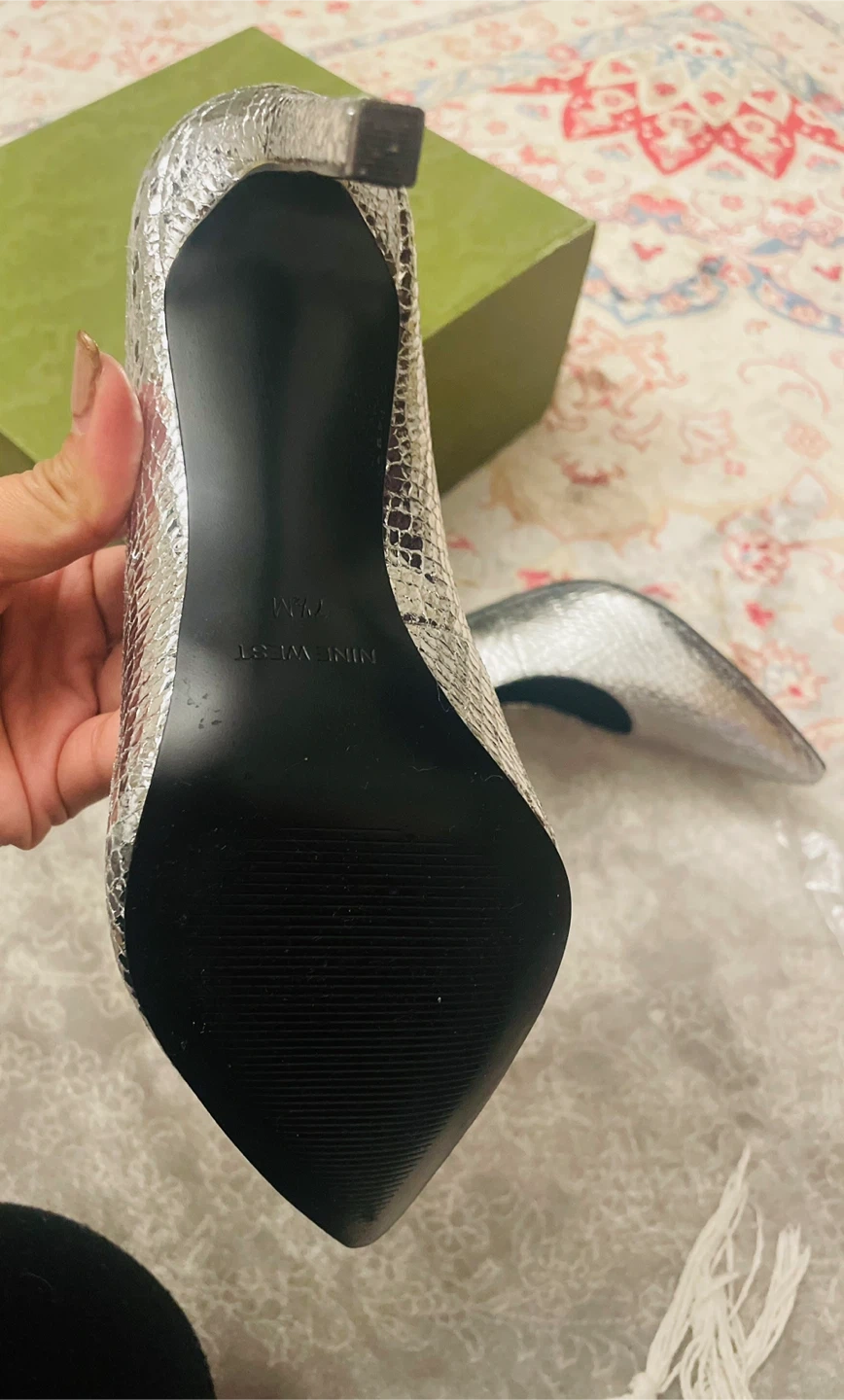 These are some silver heels from Nine West! They have a snakeskin-like texture, chic beautiful ready for new owner size US 7.5